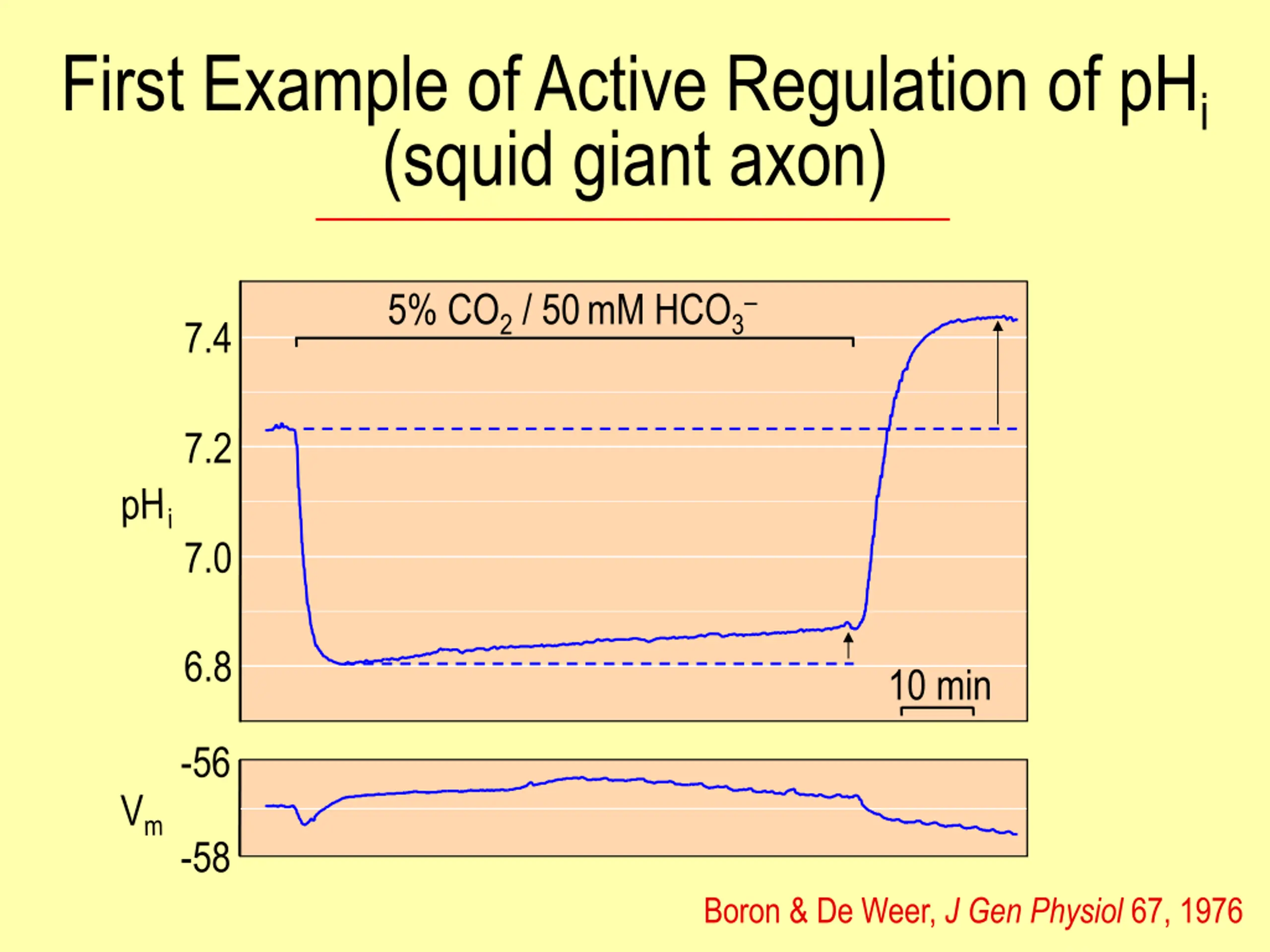 First Example of Active Regulation of pHi (squid giant axon) 5% CO2 / 50mM HCO3 7.4 7.2 7.0 6.8 10 min -56 -58 Boron & De Weer, J Gen Physiol 67, 1976