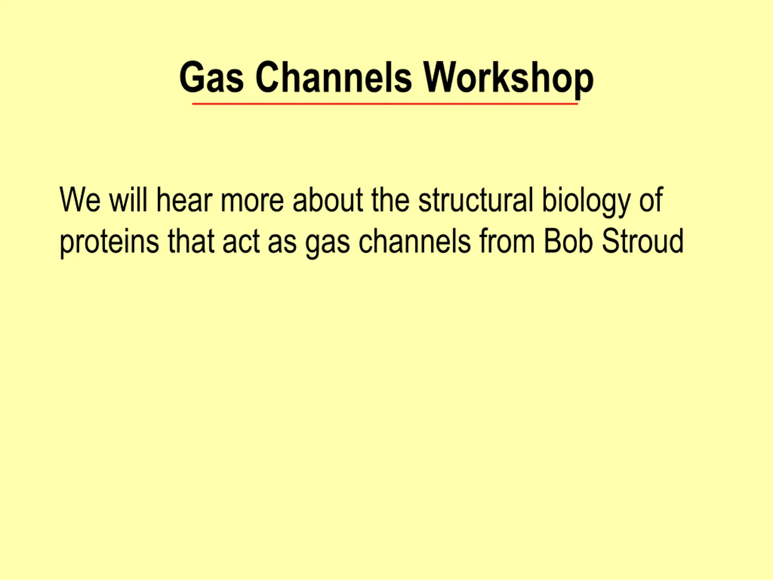 Gas Channels Workshop We will hear more about the structural biology of proteins that act as gas channels from Bob Stroud