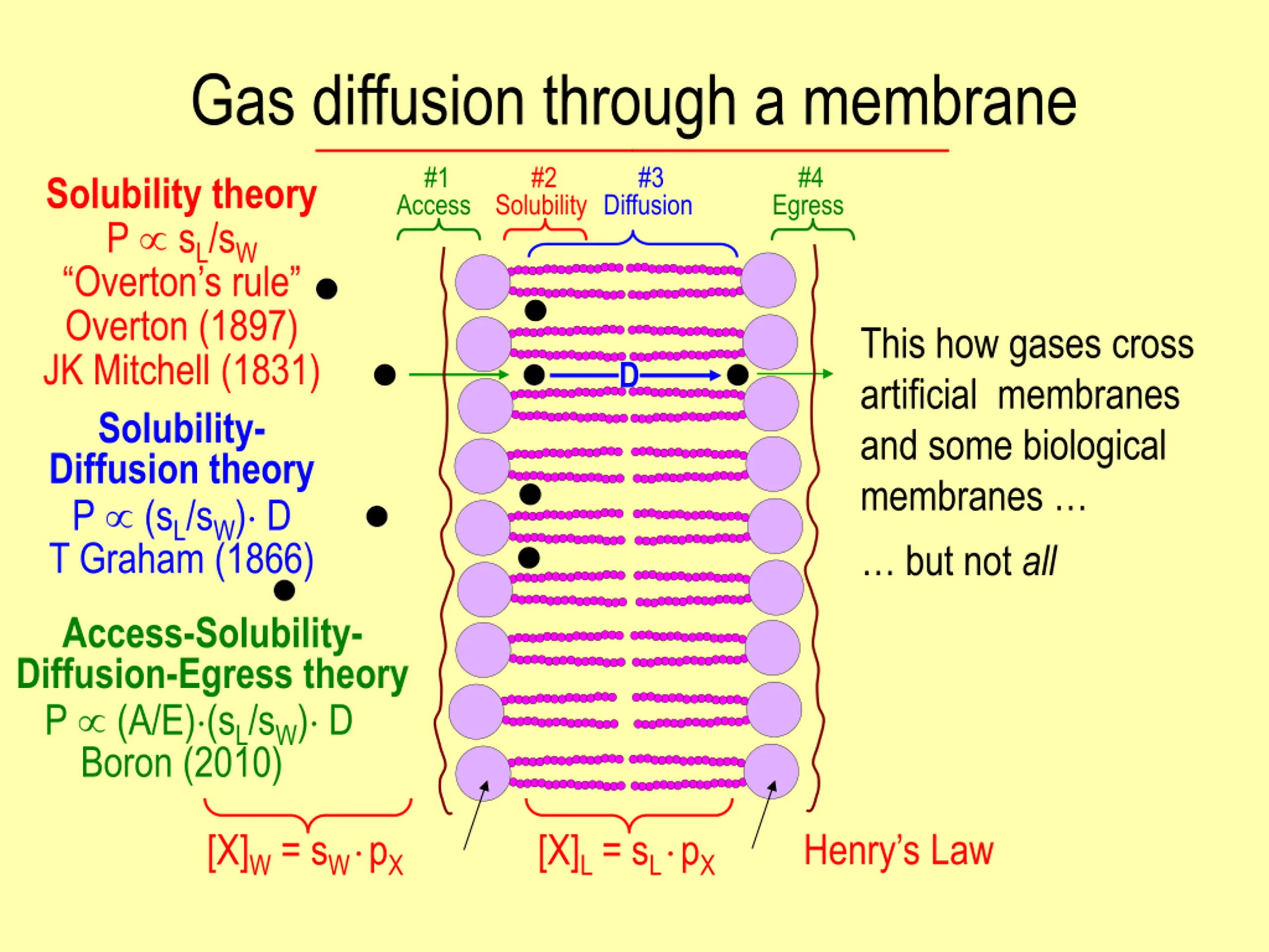 Gas diffusion through a membrane #1 #2 #3 #4 Solubility theory P sL/sW Overton s rule Overton (1897) JK Mitchell (1831) Solubility- Diffusion theory P (sL/sW) D T Graham (1866) Access Solubility Diffusion Egress This how gases cross artificial membranes and some biological membranes but not all D Access-Solubility- Diffusion-Egress theory P (A/E) (sL/sW) D Boron (2010) [X]W = sW pX [X]L = sL pX Henry s Law