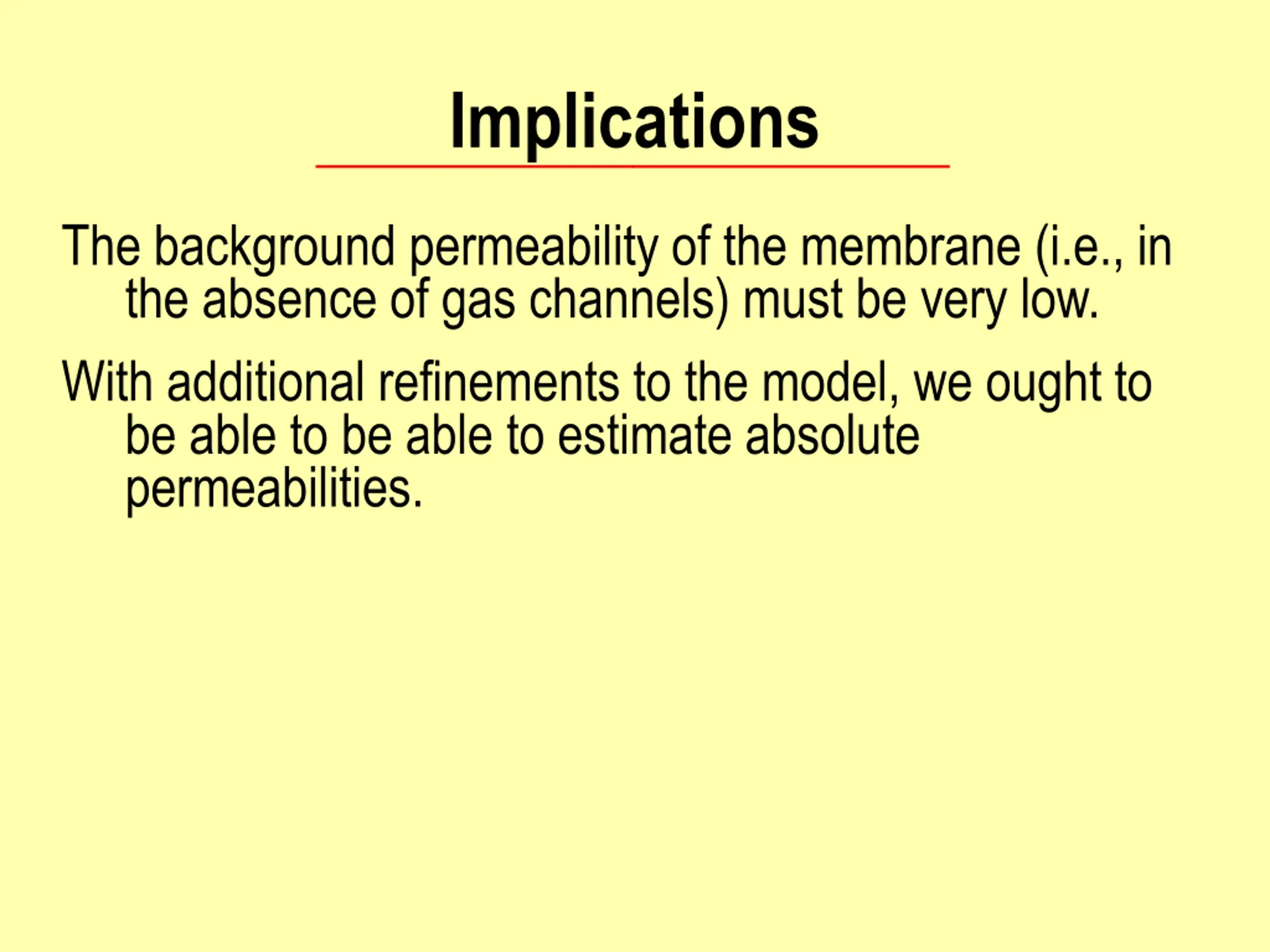 Implications The background permeability of the membrane (i.e., in the absence of gas channels) must be very low. With additional refinements to the model, we ought to be able to be able to estimate absolute permeabilities.