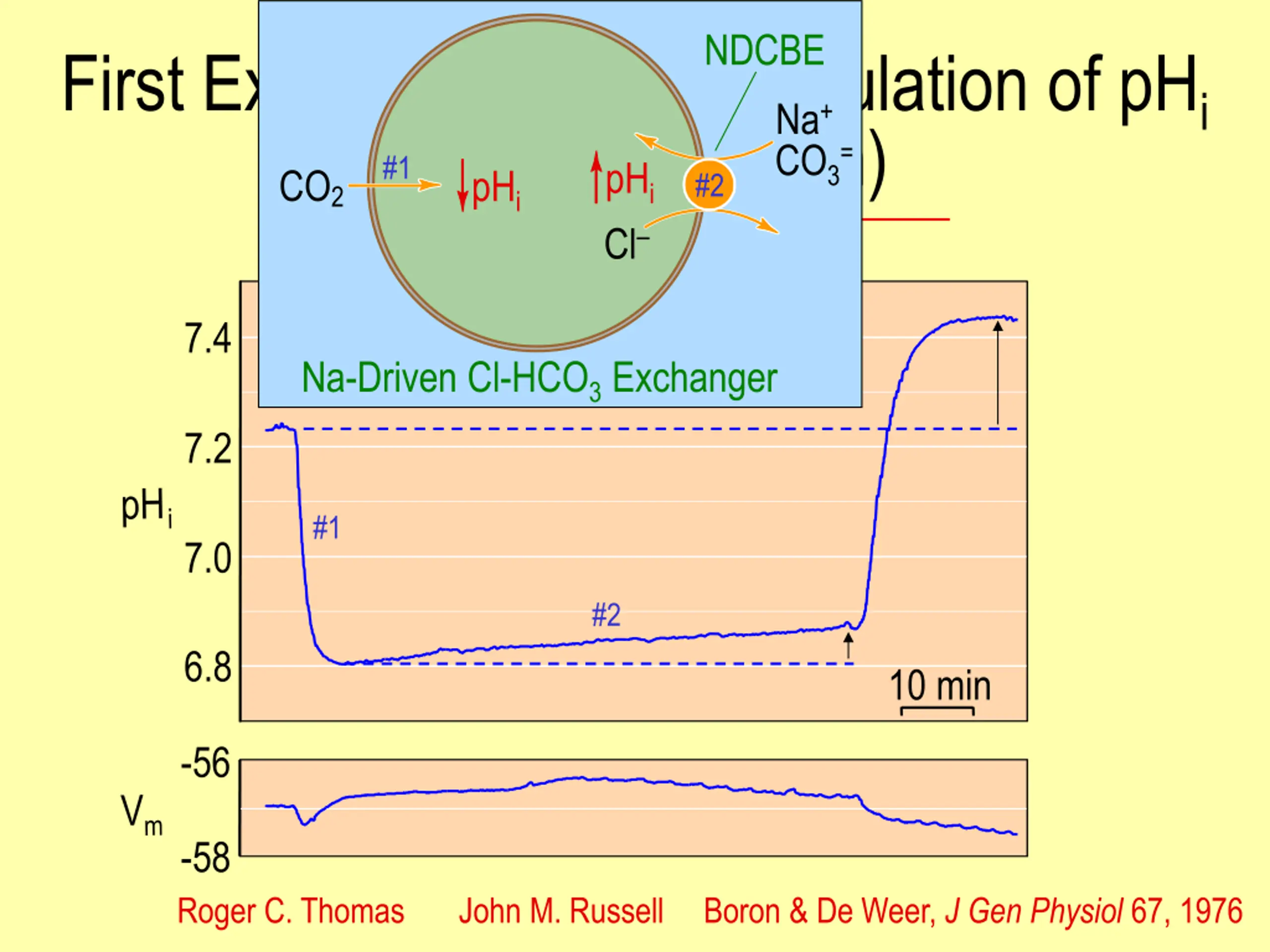 NDCBE First Example of Active Regulation of pHi CO2 pHi Na+ CO3= (squid giant axon) pHi Cl #1 #2 5% CO2 / 50mM HCO3 Na-Driven Cl-HCO3 Exchanger 7.4 7.2 #1 7.0 #2 6.8 10 min -56 -58 Roger C. Thomas John M. Russell Boron & De Weer, J Gen Physiol 67, 1976