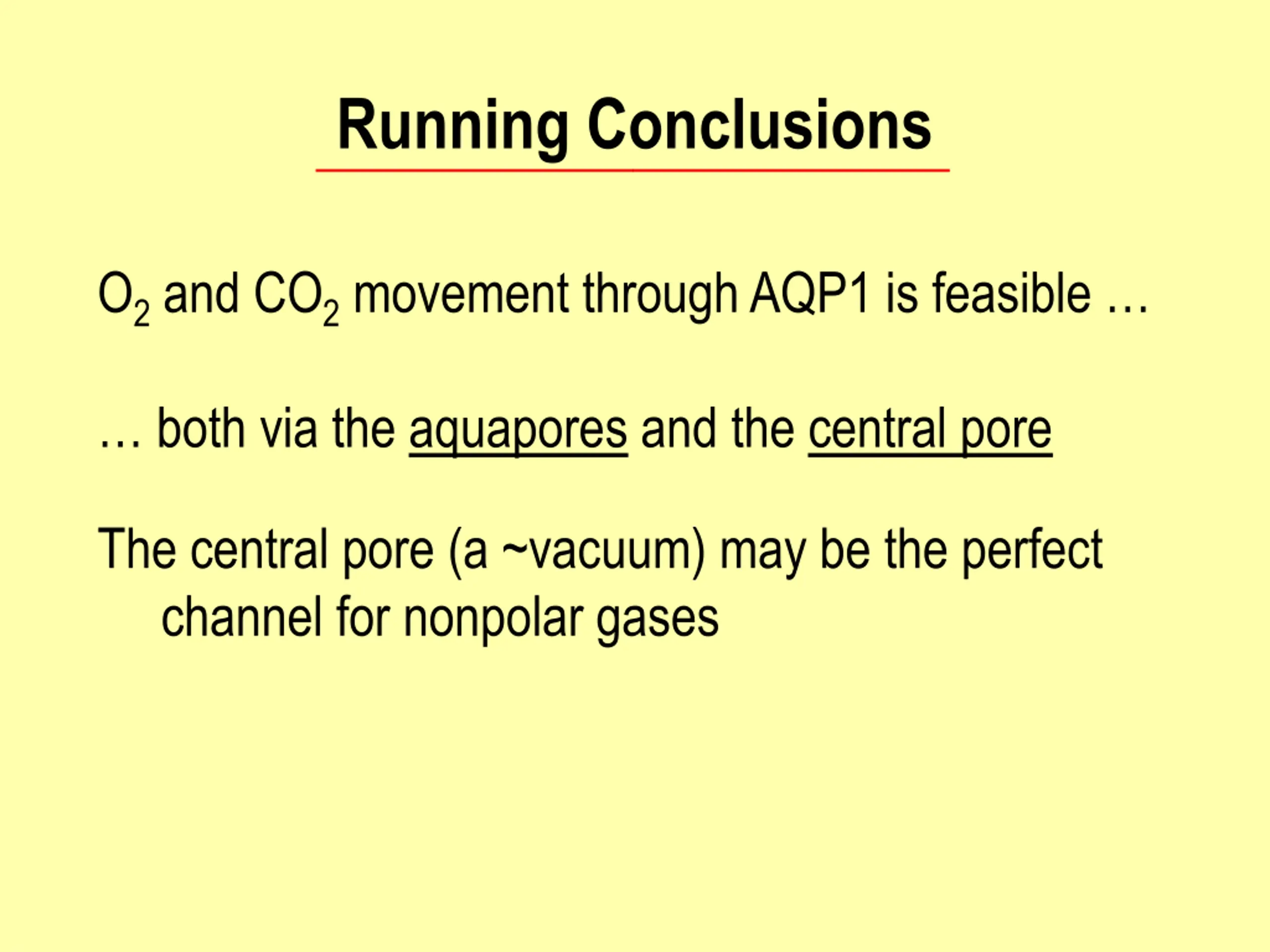 Running Conclusions O2 and CO2movement through AQP1 is feasible both via the aquapores and the central pore The central pore (a ~vacuum) may be the perfect channel for nonpolar gases