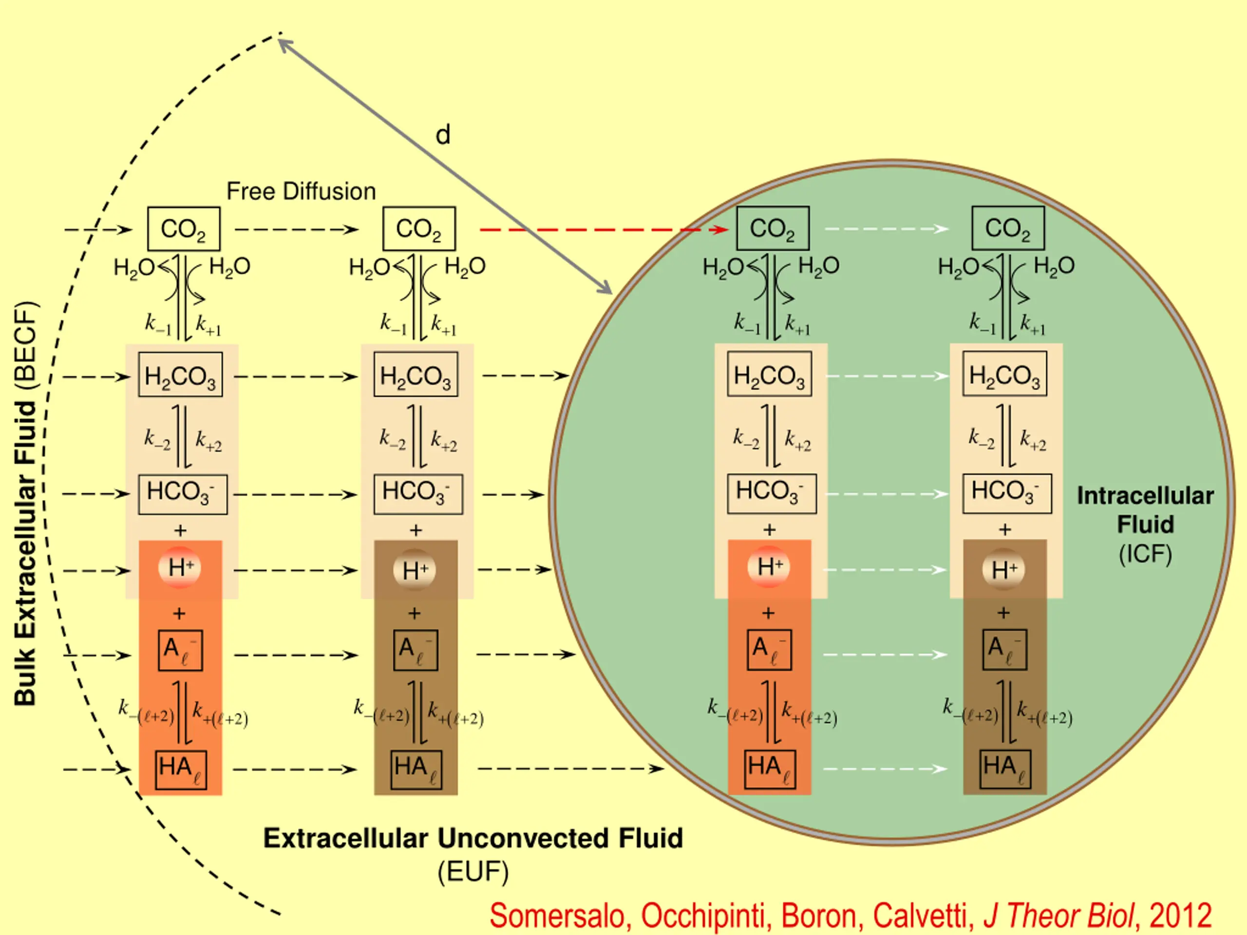 d Free Diffusion CO2 CO2 CO2 CO2 H2O H2O H2O H2O H2O H2O H2O H2O Bulk Extracellular Fluid (BECF) k k k k k+ k+ k+ k+ 1 1 1 1 1 1 1 1 H2CO3 H2CO3 H2CO3 H2CO3 k k k k k+ k+ k+ k+ 2 2 2 2 2 2 2 2 HCO3- + HCO3- + H+ HCO3- + HCO3- + H+ Intracellular Fluid (ICF) H+ H+ + + + + A A A A k + k + k + k + k+ + k+ + k+ + k+ + ( ) 2 ( ) 2 ( ) 2 ( ) 2 ( ) 2 ( ) 2 ( ) 2 ( ) 2 HA HA HA HA Extracellular Unconvected Fluid (EUF) Somersalo, Occhipinti, Boron, Calvetti, J Theor Biol, 2012