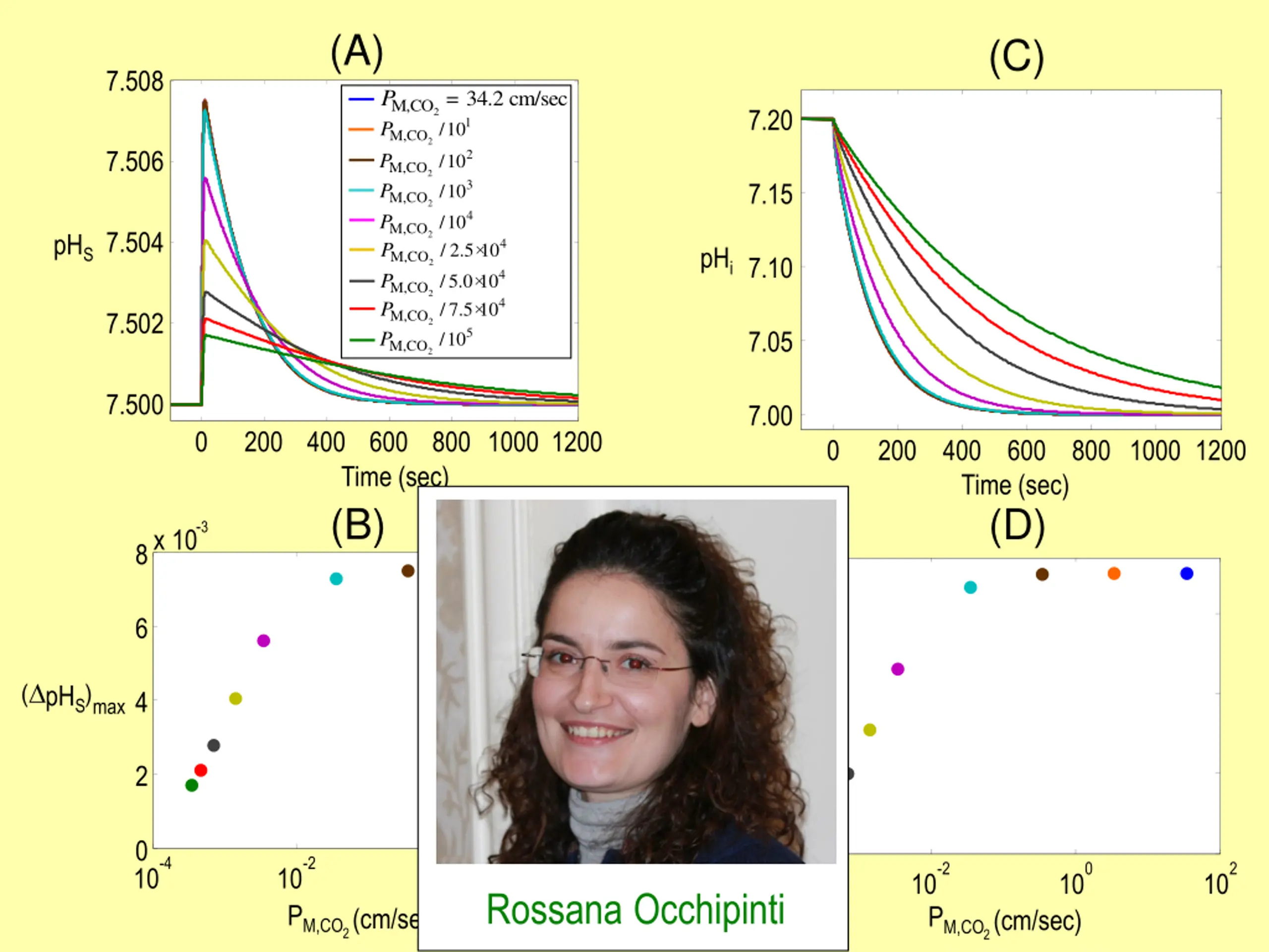 (A) (C) 7.508 M,CO P M,CO/10 P M,CO/10 P M,CO/10 P M,CO/10 P M,CO/ 2.5 10 P M,CO/5.0 10 P M,CO/7.5 10 P M,CO/10 P = 34.2 cm/sec 1 7.20 2 2 7.506 2 2 3 7.15 2 4 7.504 pHS 2 4 pHi 7.10 2 4 2 4 7.502 2 5 7.05 2 7.500 7.00 0 200 400 600 800 1000 1200 Time (sec) (B) 0 200 400 Time (sec) (D) 600 800 1000 1200 -3 -3 x10 x 10 8 3 6 ( pHS)max 2 4 -(dpHi/dt)max 1 2 0 0 10 -4 -2 0 2 -2 0 2 -4 10 10 PM,CO2(cm/sec) 10 10 10 10 10 Rossana Occhipinti PM,CO2(cm/sec)