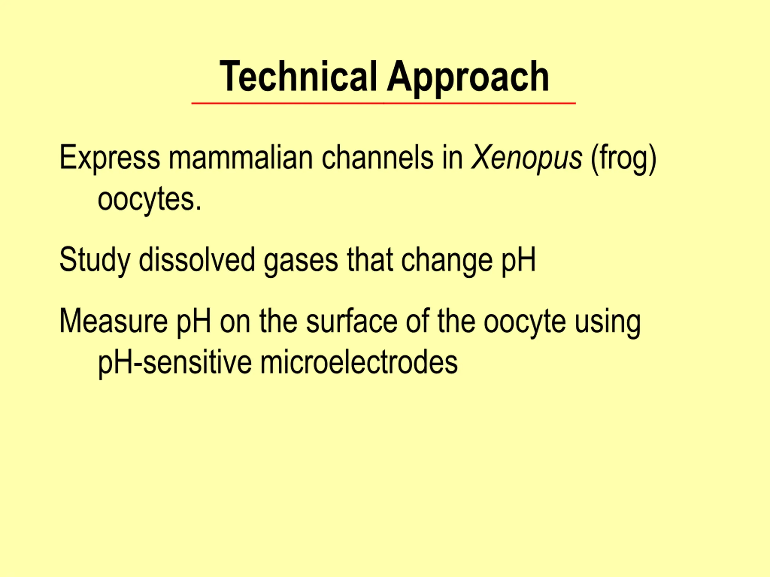 Technical Approach Express mammalian channels in Xenopus (frog) oocytes. Study dissolved gases that change pH Measure pH on the surface of the oocyte using pH-sensitive microelectrodes
