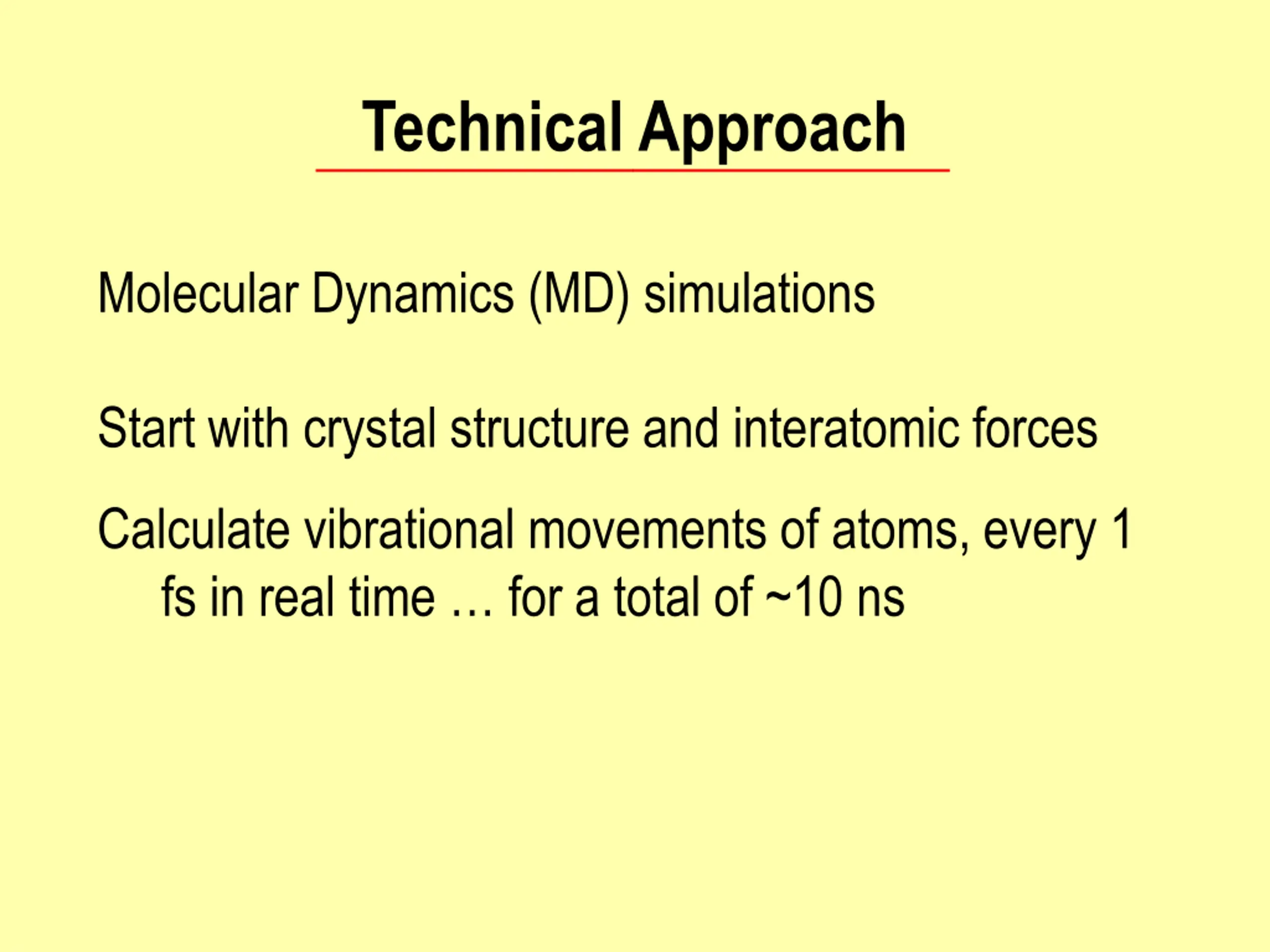 Technical Approach Molecular Dynamics (MD) simulations Start with crystal structure and interatomic forces Calculate vibrational movements of atoms, every 1 fs in real time for a total of ~10 ns