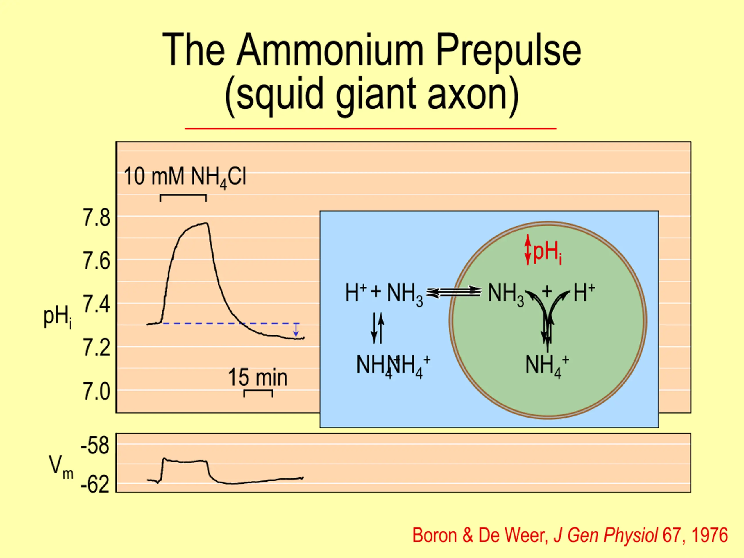 The Ammonium Prepulse (squid giant axon) 10 mM NH4Cl 7.8 pHi pHi + 7.6 H++ NH3 NH3 H+ 7.4 pHi 7.2 NH4+ NH4+ NH4+ 15 min 7.0 -58 -62 Boron & De Weer, J Gen Physiol 67, 1976