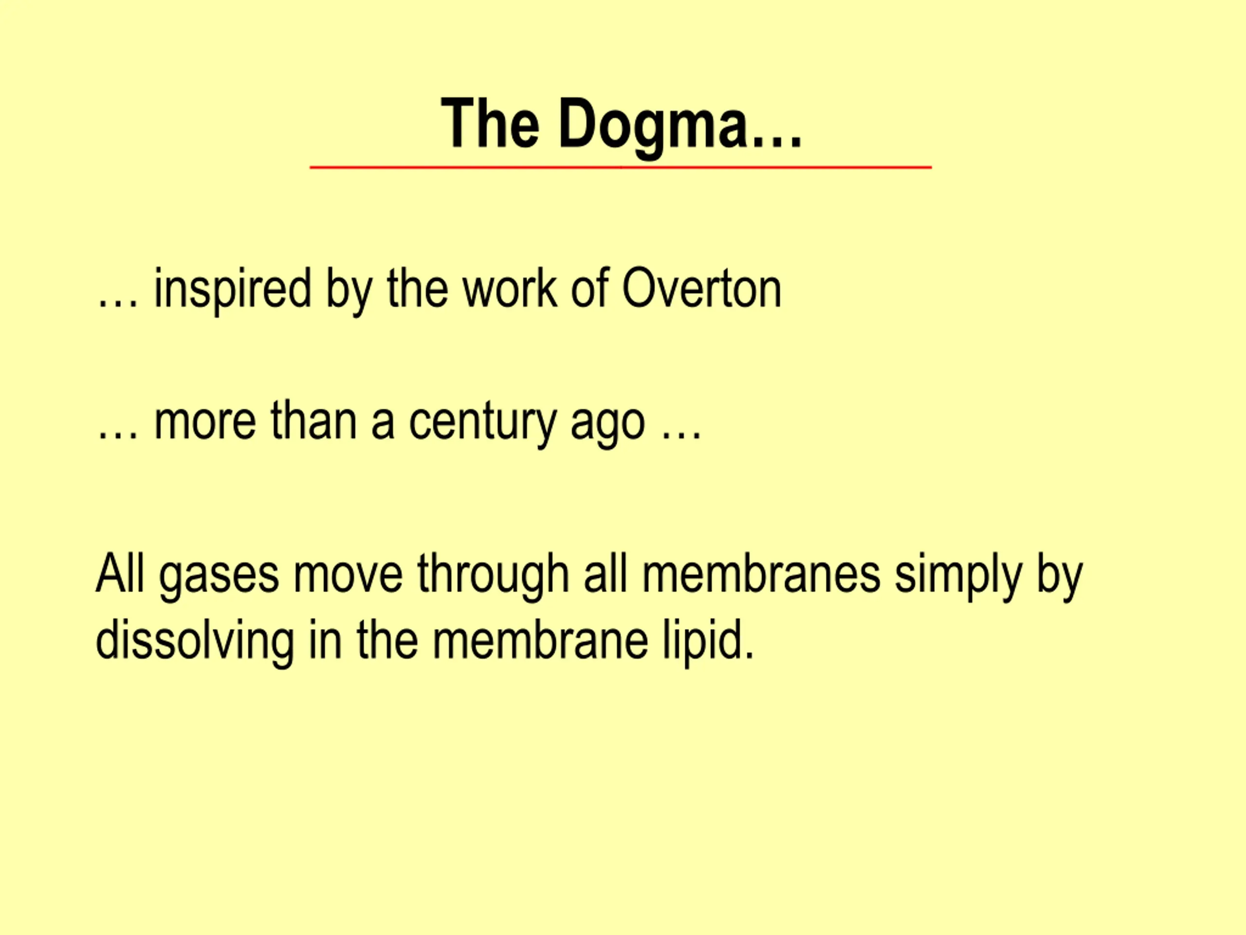 The Dogma inspired by the work of Overton more than a century ago All gases move through all membranes simply by dissolving in the membrane lipid.