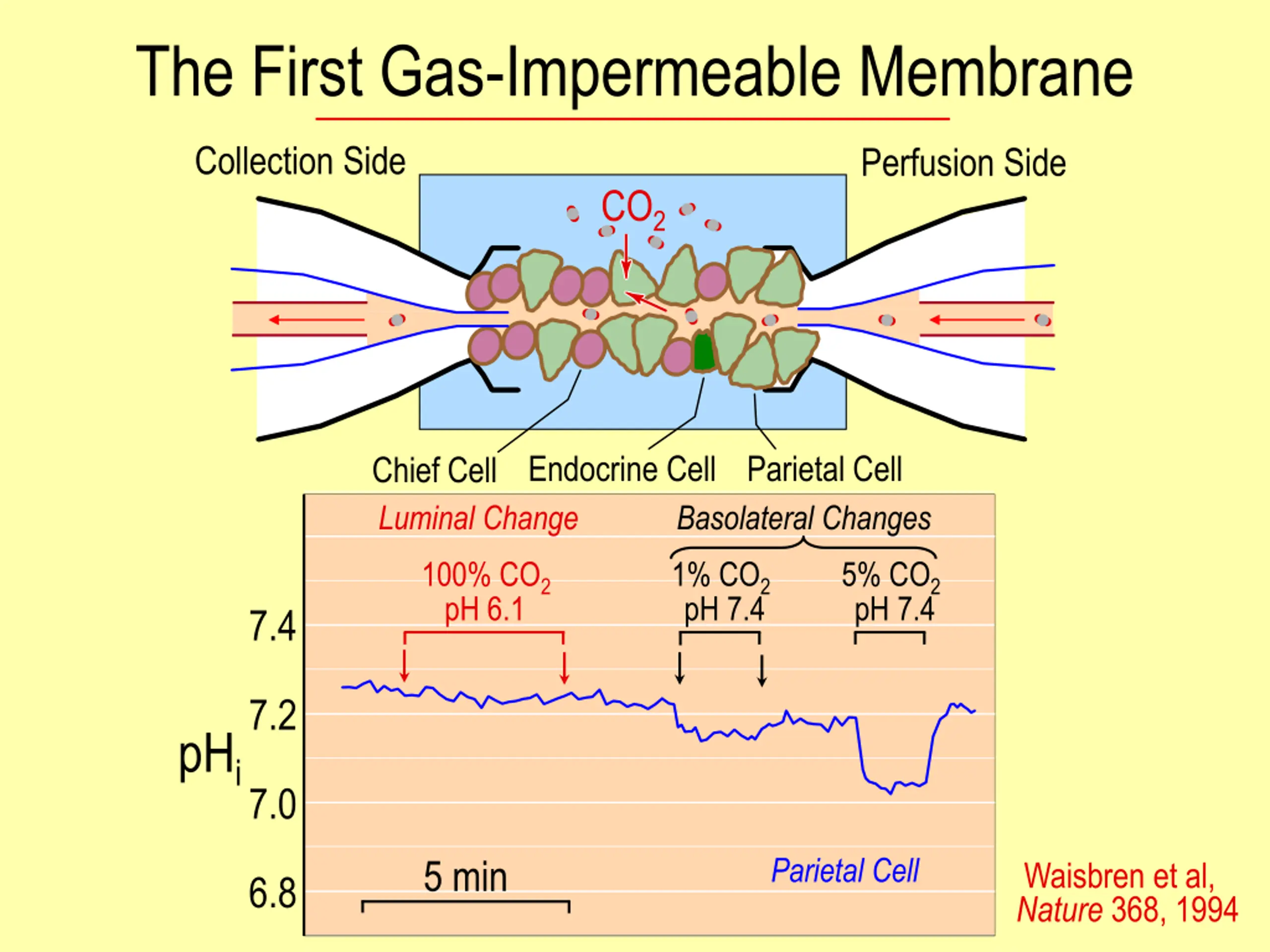 The First Gas-Impermeable Membrane Collection Side Perfusion Side CO2 Endocrine Cell Parietal Cell Chief Cell Luminal Change Basolateral Changes 100% CO2 pH 6.1 1% CO2 pH 7.4 5% CO2 pH 7.4 7.4 7.2 pHi 7.0 Parietal Cell 5 min Waisbren et al, Nature 368, 1994 6.8