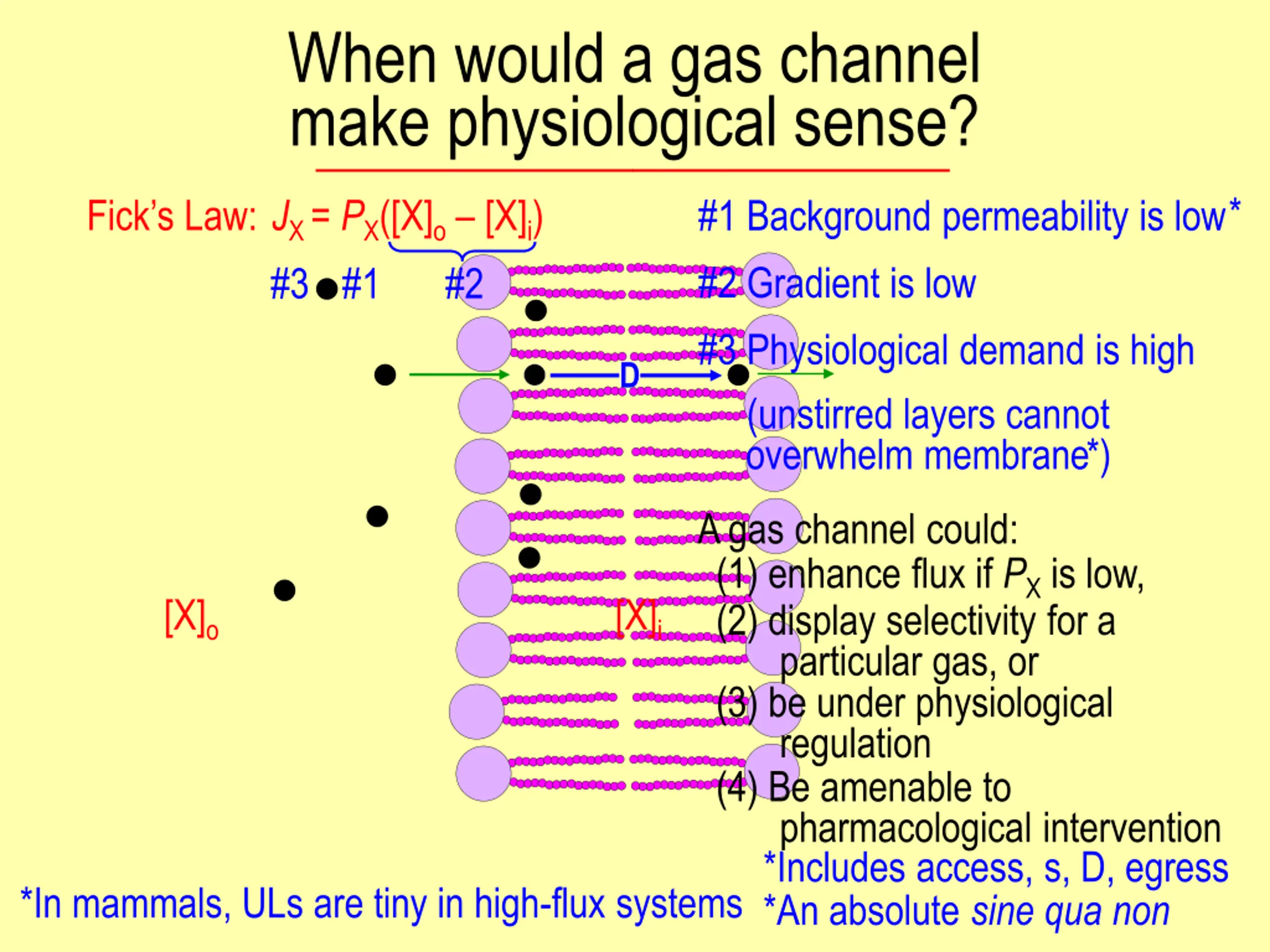 When would a gas channel make physiological sense? * Fick s Law: JX = PX([X]o [X]i) #1 #3 #1 Background permeability is low #2 Gradient is low #3 Physiological demand is high (unstirred layers cannot overwhelm membrane ) #2 D * A gas channel could: (1) enhance flux if PX is low, (2) display selectivity for a particular gas, or [X]o [X]i (3) be under physiological regulation (4) Be amenable to pharmacological intervention *Includes access, s, D, egress *In mammals, ULs are tiny in high-flux systems *An absolute sine qua non