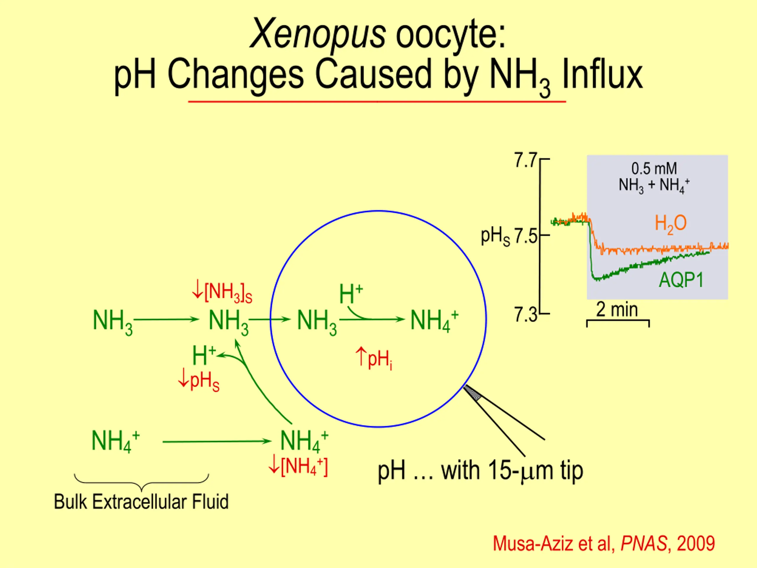 Xenopus oocyte: pH Changes Caused by NH3 Influx 7.7 0.5 mM NH3 + NH4+ H2O pHS7.5 AQP1 [NH3]S H+ 2 min 7.3 NH3 NH3 H+ pHS NH3 NH4+ pHi NH4+ NH4+ [NH4+] pH with 15- m tip Bulk Extracellular Fluid Musa-Aziz et al, PNAS, 2009