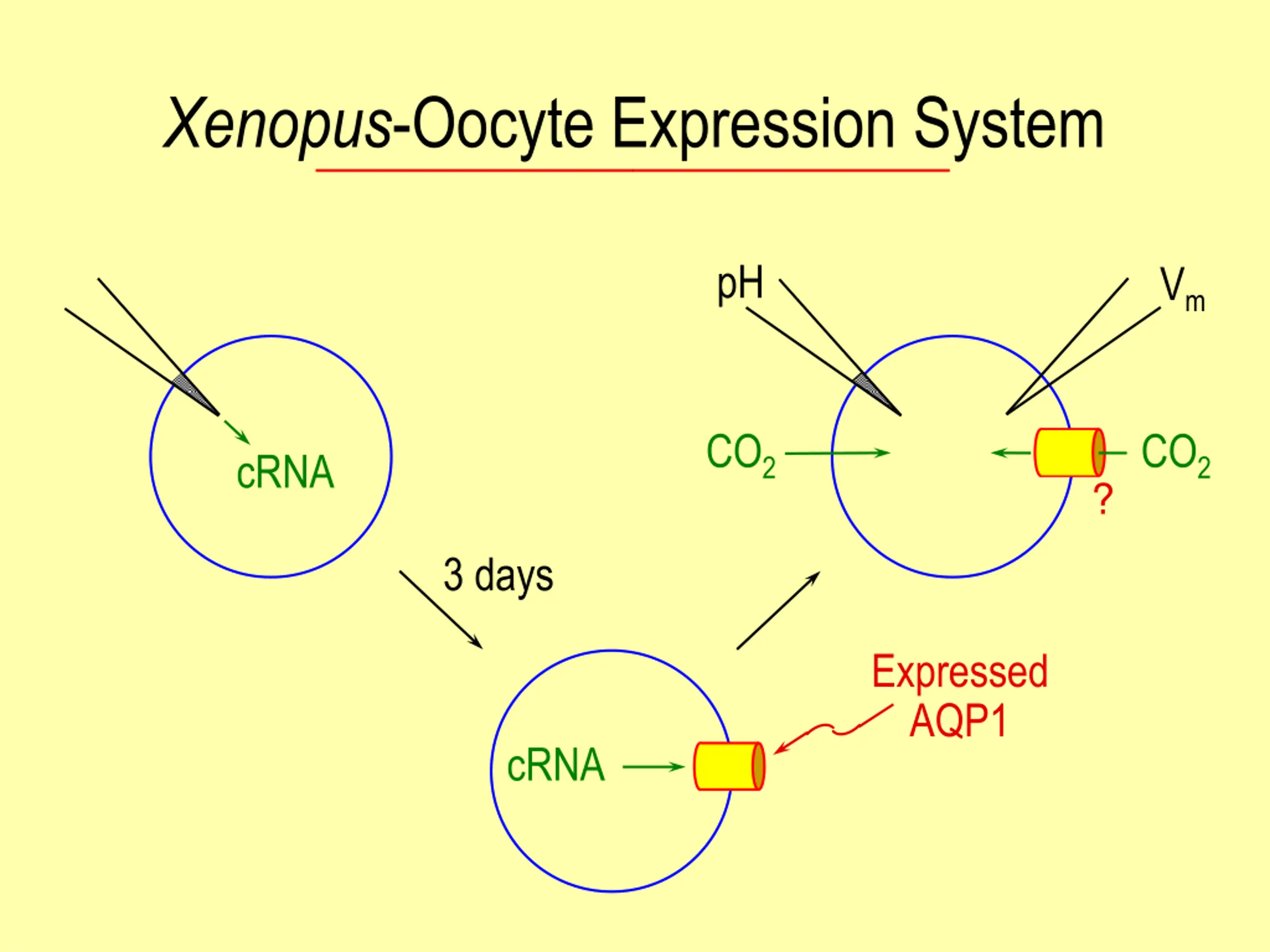 Xenopus-Oocyte Expression System pH Vm CO2 CO2 cRNA ? 3 days Expressed AQP1 cRNA
