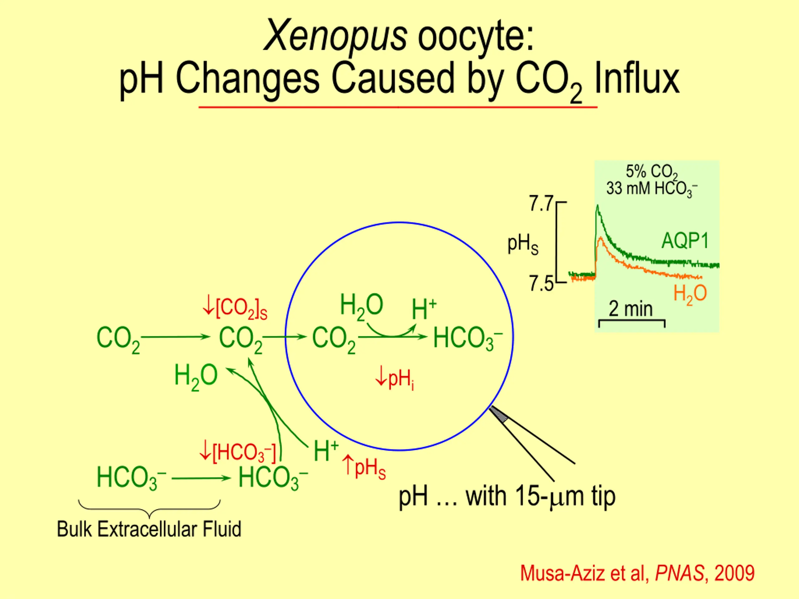 Xenopus oocyte: pH Changes Caused by CO2 Influx 5% CO2 33 mM HCO3 7.7 AQP1 pHS 7.5 H2O H2O [CO2]S H+ 2 min CO2 CO2 CO2 HCO3 H2O pHi HCO3 H+ [HCO3 ] pHS HCO3 pH with 15- m tip Bulk Extracellular Fluid Musa-Aziz et al, PNAS, 2009