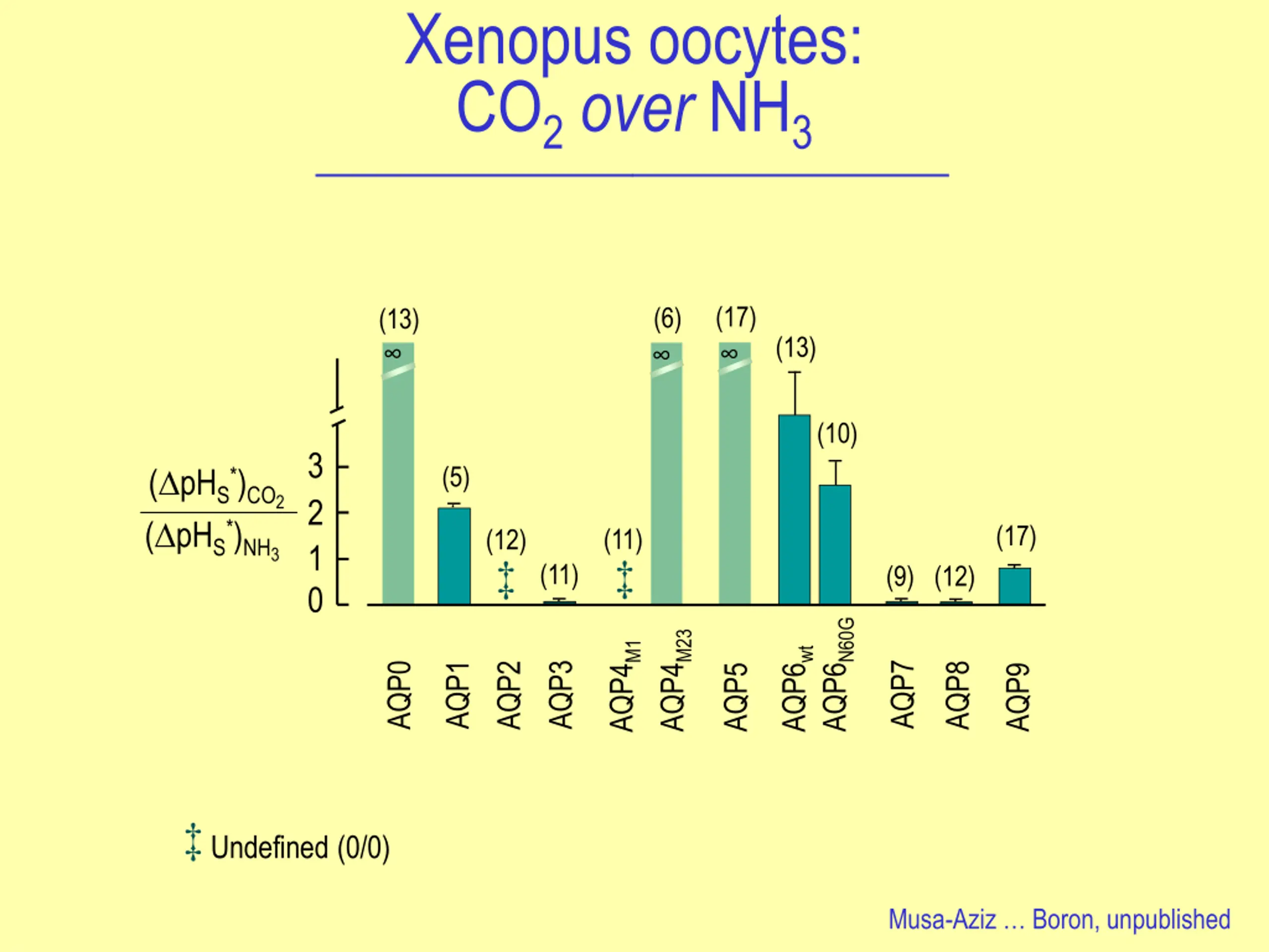 Xenopus oocytes: CO2over NH3 (17) (6) (13) (13) (10) 3 ( pHS*)CO2 ( pHS*)NH3 (5) 2 (17) (11) (12) 1 (11) (9) (12) 0 AQP6N60G AQP4M23 AQP4M1 AQP6wt AQP7 AQP1 AQP3 AQP0 AQP2 AQP8 AQP5 AQP9 Undefined (0/0) Musa-Aziz Boron, unpublished