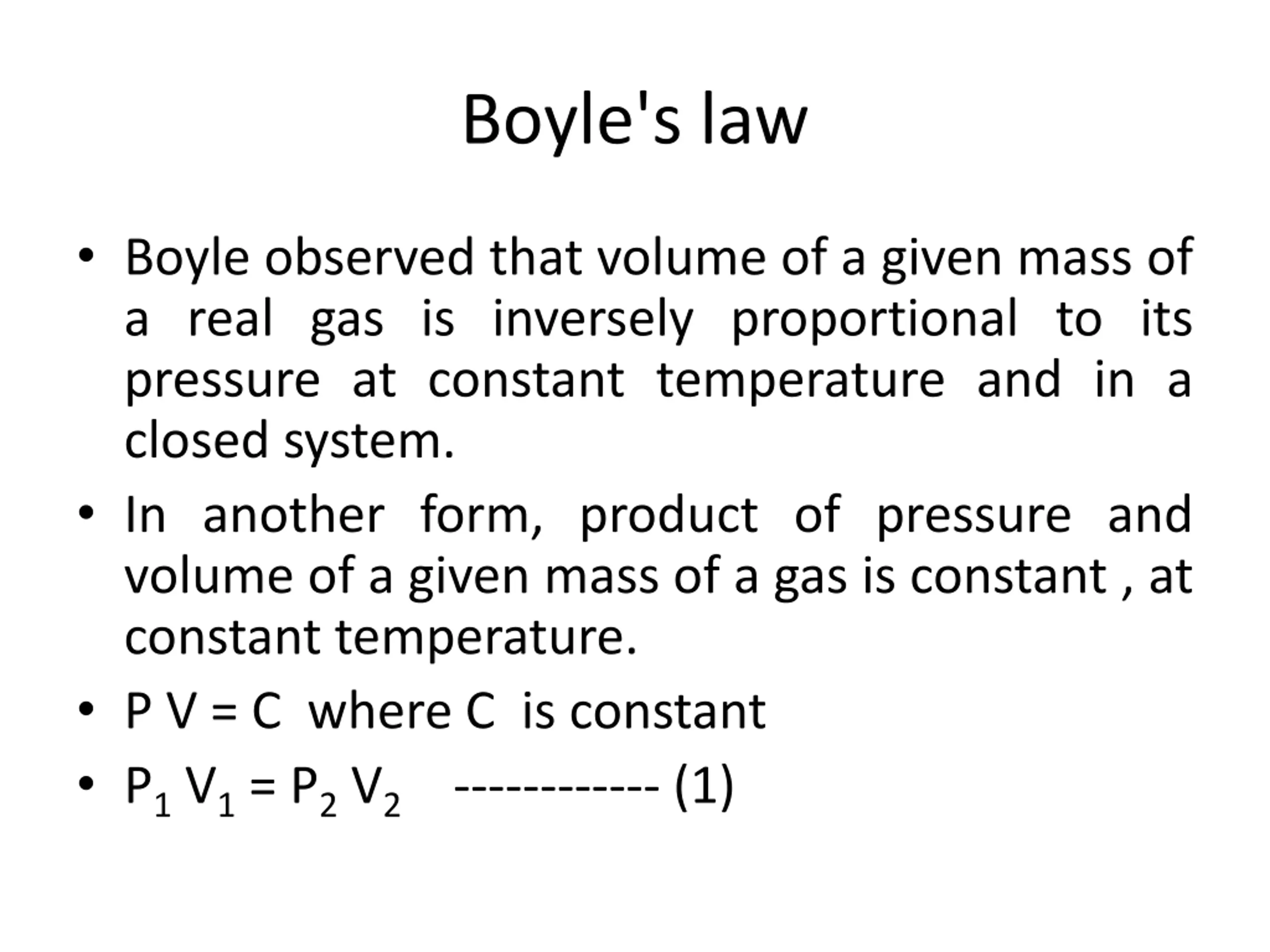 Boyle's law Boyle observed that volume of a given mass of a real gas is inversely proportional to its pressure at constant temperature and in a closed system. In another form, product of pressure and volume of a given mass of a gas is constant , at constant temperature. P V = C where C is constant P1V1= P2V2 ------------ (1)