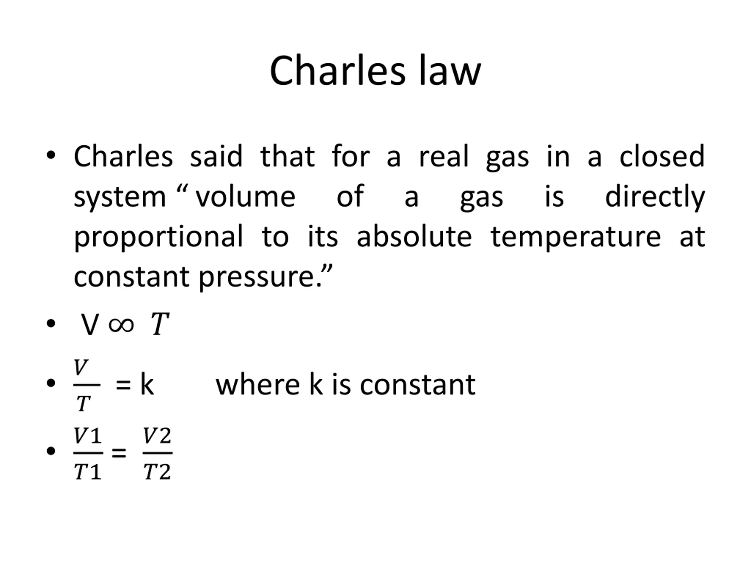 Charles law Charles said that for a real gas in a closed system volume of proportional to its absolute temperature at constant pressure. V ? a gas is directly ? ?= k ?1 ?1= where k is constant ?2 ?2