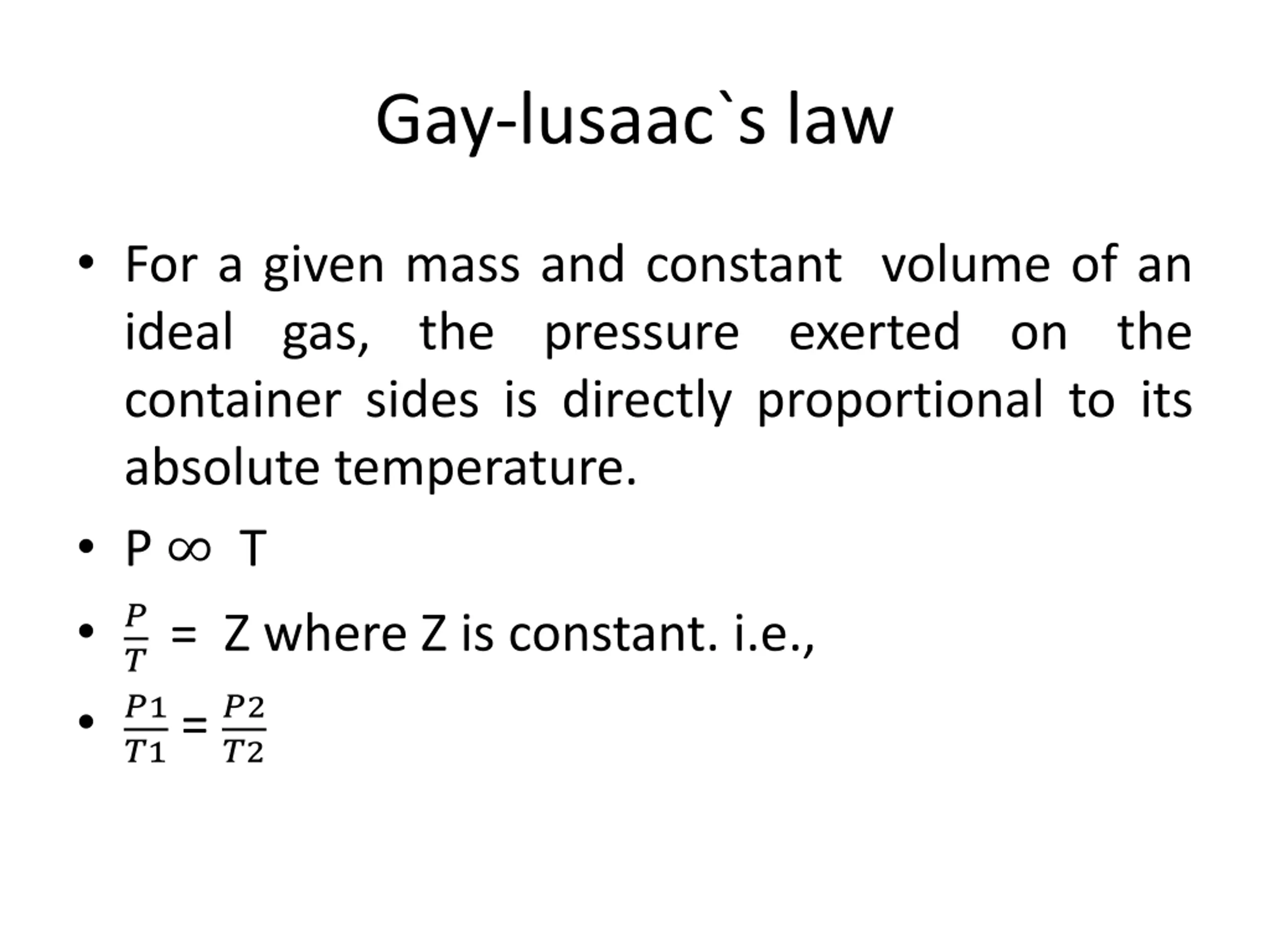 Gay-lusaac`s law For a given mass and constant volume of an ideal gas, the pressure exerted on the container sides is directly proportional to its absolute temperature. P T ?2 ? ?= Z where Z is constant. i.e., ?1 ?1=?2