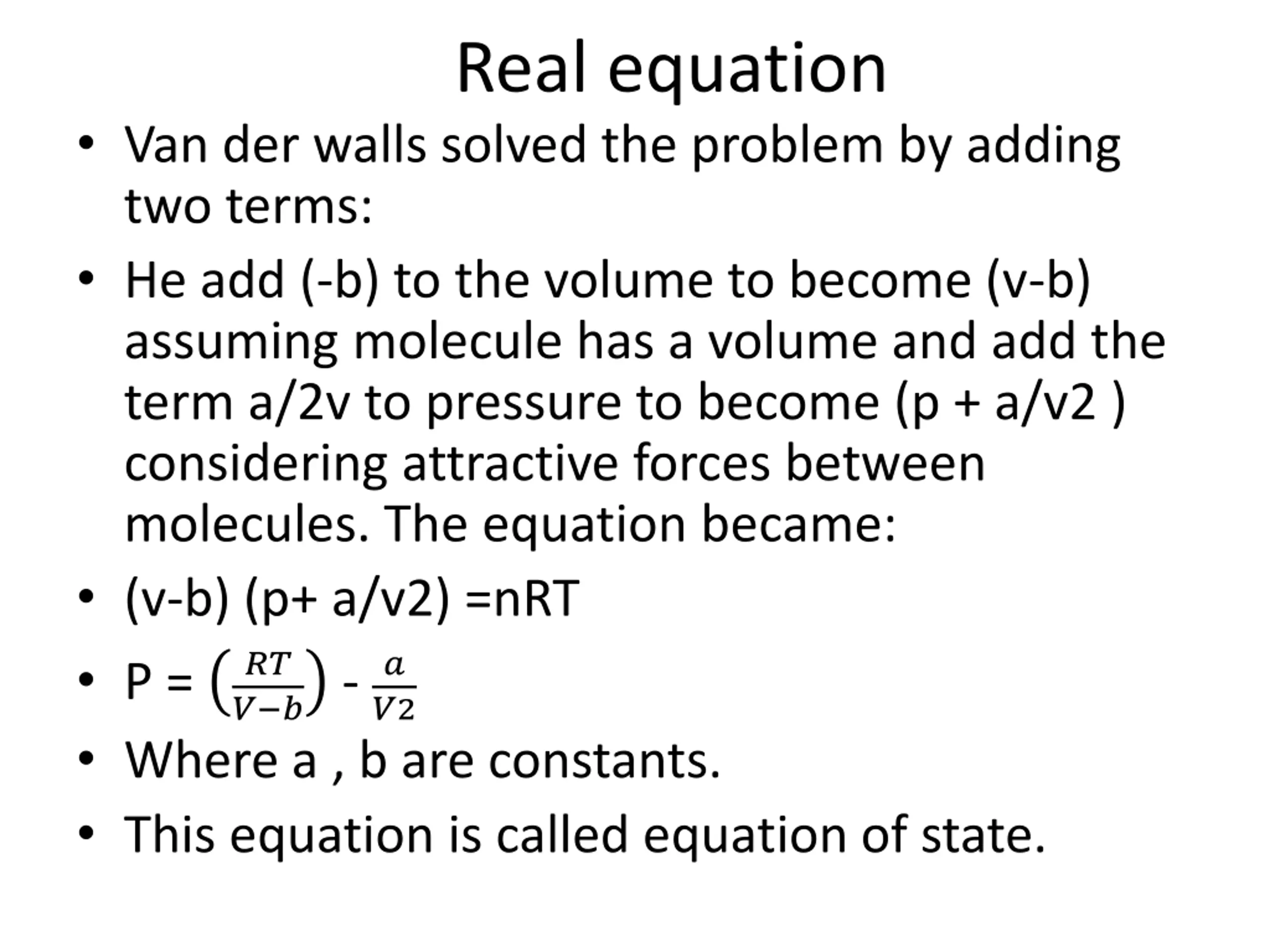 Real equation Van der walls solved the problem by adding two terms: He add (-b) to the volume to become (v-b) assuming molecule has a volume and add the term a/2v to pressure to become (p + a/v2 ) considering attractive forces between molecules. The equation became: (v-b) (p+ a/v2) =nRT P = ?2 Where a , b are constants. This equation is called equation of state. ?? ? ?- ?