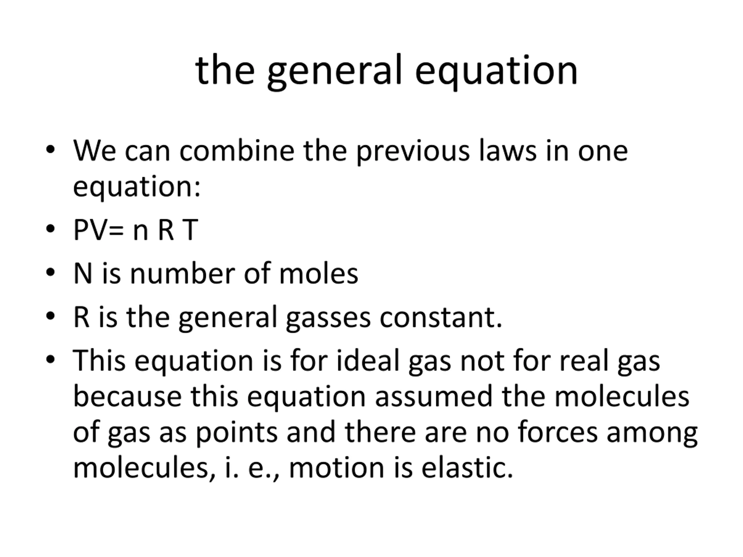 the general equation We can combine the previous laws in one equation: PV= n R T N is number of moles R is the general gasses constant. This equation is for ideal gas not for real gas because this equation assumed the molecules of gas as points and there are no forces among molecules, i. e., motion is elastic.