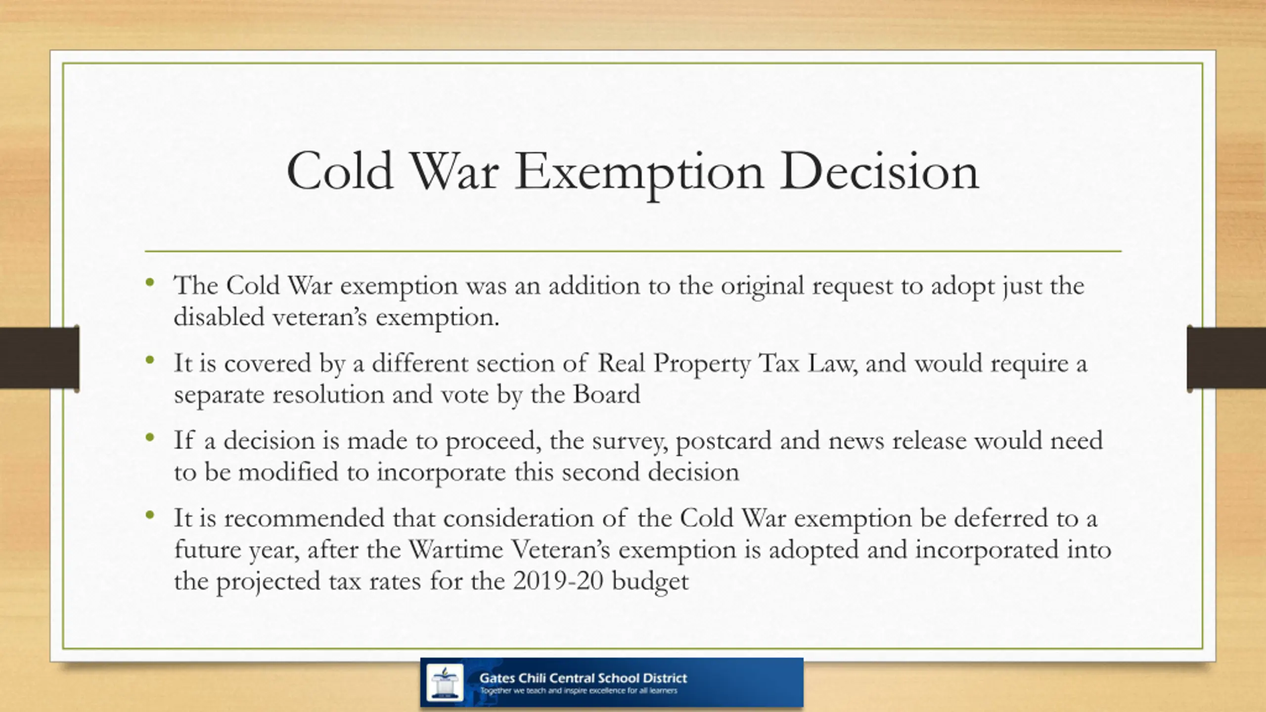 Cold War Exemption Decision The Cold War exemption was an addition to the original request to adopt just the disabled veteran s exemption. It is covered by a different section of Real Property Tax Law, and would require a separate resolution and vote by the Board If a decision is made to proceed, the survey, postcard and news release would need to be modified to incorporate this second decision It is recommended that consideration of the Cold War exemption be deferred to a future year, after the Wartime Veteran s exemption is adopted and incorporated into the projected tax rates for the 2019-20 budget
