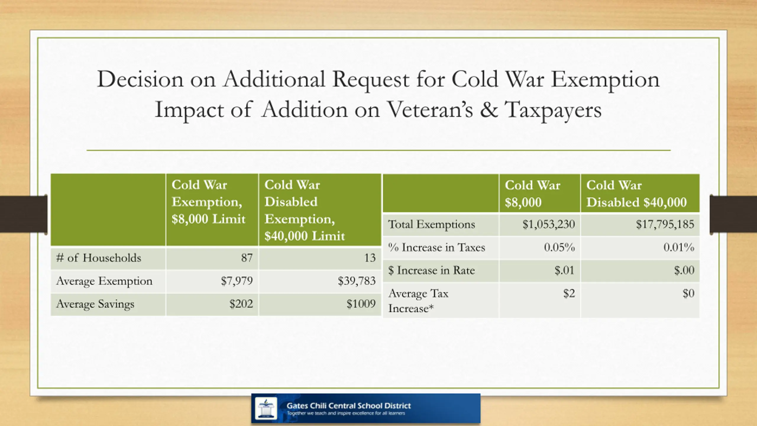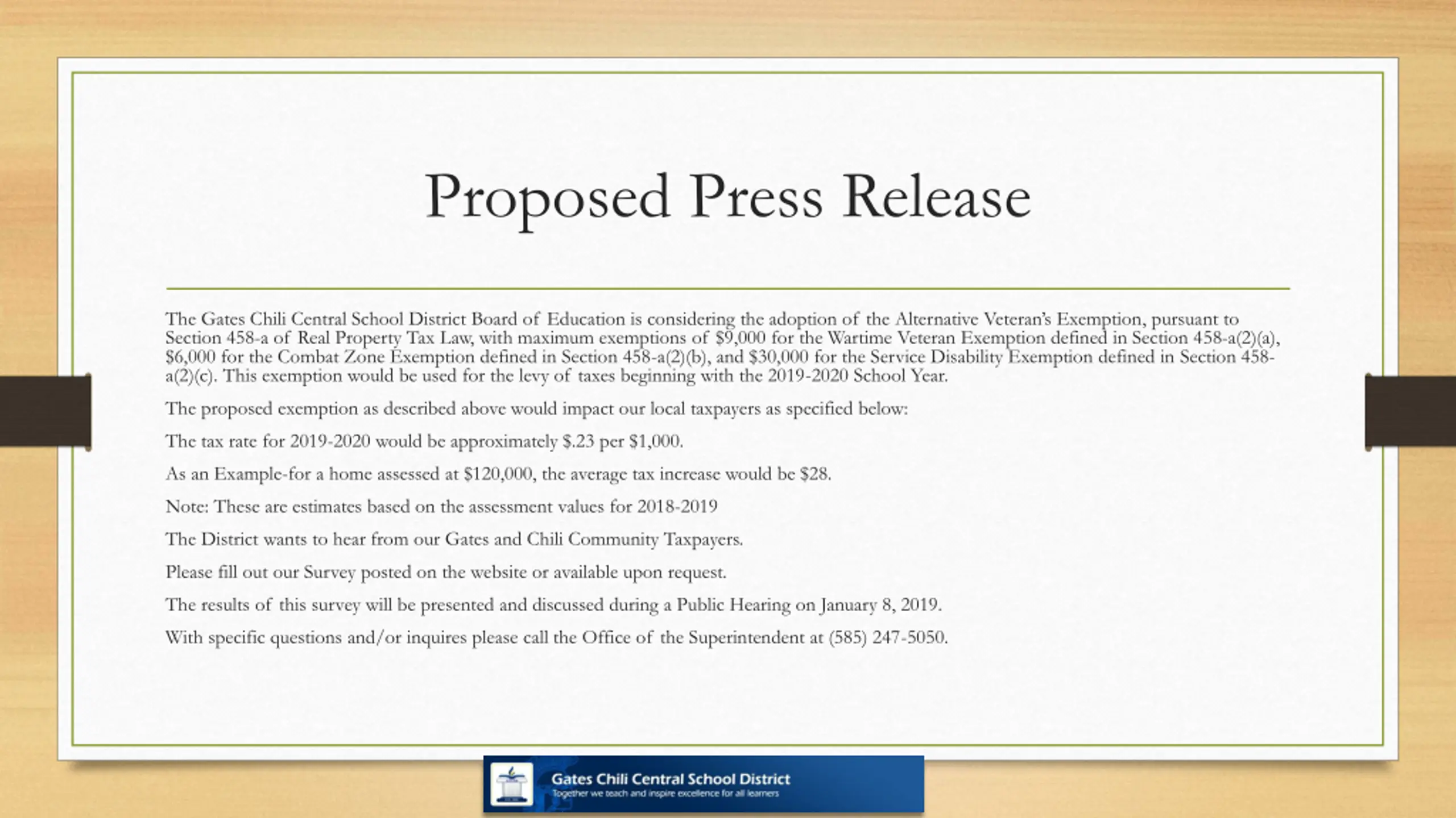 Proposed Press Release The Gates Chili Central School District Board of Education is considering the adoption of the Alternative Veteran s Exemption, pursuant to Section 458-a of Real Property Tax Law, with maximum exemptions of $9,000 for the Wartime Veteran Exemption defined in Section 458-a(2)(a), $6,000 for the Combat Zone Exemption defined in Section 458-a(2)(b), and $30,000 for the Service Disability Exemption defined in Section 458- a(2)(c). This exemption would be used for the levy of taxes beginning with the 2019-2020 School Year. The proposed exemption as described above would impact our local taxpayers as specified below: The tax rate for 2019-2020 would be approximately $.23 per $1,000. As an Example-for a home assessed at $120,000, the average tax increase would be $28. Note: These are estimates based on the assessment values for 2018-2019 The District wants to hear from our Gates and Chili Community Taxpayers. Please fill out our Survey posted on the website or available upon request. The results of this survey will be presented and discussed during a Public Hearing on January 8, 2019. With specific questions and/or inquires please call the Office of the Superintendent at (585) 247-5050.