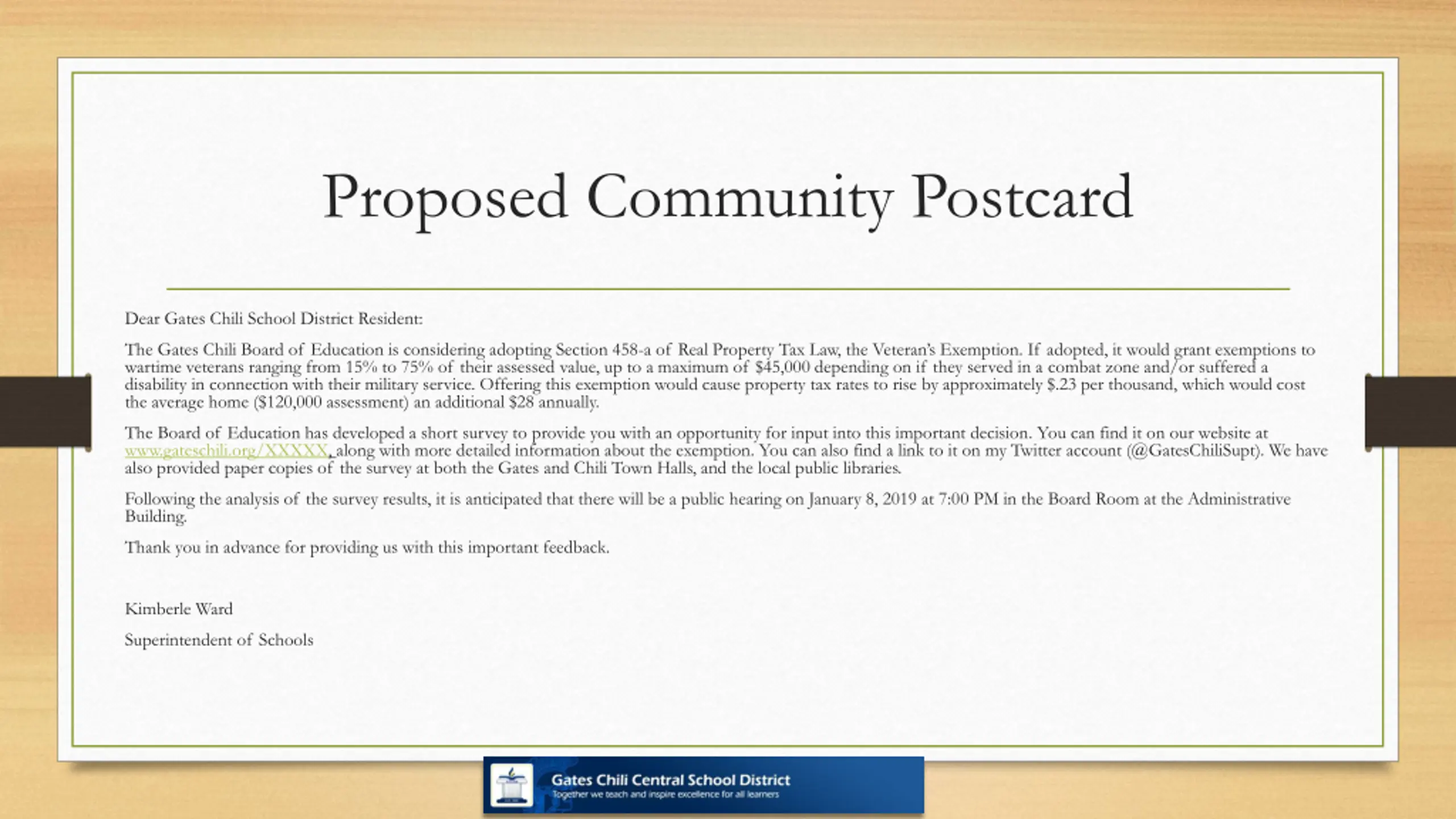 Proposed Community Postcard Dear Gates Chili School District Resident: The Gates Chili Board of Education is considering adopting Section 458-a of Real Property Tax Law, the Veteran s Exemption. If adopted, it would grant exemptions to wartime veterans ranging from 15% to 75% of their assessed value, up to a maximum of $45,000 depending on if they served in a combat zone and/or suffered a disability in connection with their military service. Offering this exemption would cause property tax rates to rise by approximately $.23 per thousand, which would cost the average home ($120,000 assessment) an additional $28 annually. The Board of Education has developed a short survey to provide you with an opportunity for input into this important decision. You can find it on our website at www.gateschili.org/XXXXX, along with more detailed information about the exemption. You can also find a link to it on my Twitter account (@GatesChiliSupt). We have also provided paper copies of the survey at both the Gates and Chili Town Halls, and the local public libraries. Following the analysis of the survey results, it is anticipated that there will be a public hearing on January 8, 2019 at 7:00 PM in the Board Room at the Administrative Building. Thank you in advance for providing us with this important feedback. Kimberle Ward Superintendent of Schools