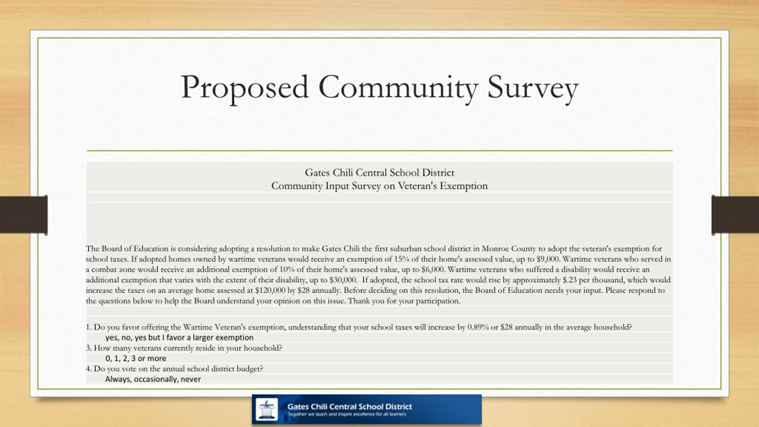 Proposed Community Survey Gates Chili Central School District Community Input Survey on Veteran's Exemption The Board of Education is considering adopting a resolution to make Gates Chili the first suburban school district in Monroe County to adopt the veteran's exemption for school taxes. If adopted homes owned by wartime veterans would receive an exemption of 15% of their home's assessed value, up to $9,000. Wartime veterans who served in a combat zone would receive an additional exemption of 10% of their home's assessed value, up to $6,000. Wartime veterans who suffered a disability would receive an additional exemption that varies with the extent of their disability, up to $30,000. If adopted, the school tax rate would rise by approximately $.23 per thousand, which would increase the taxes on an average home assessed at $120,000 by $28 annually. Before deciding on this resolution, the Board of Education needs your input. Please respond to the questions below to help the Board understand your opinion on this issue. Thank you for your participation. 1. Do you favor offering the Wartime Veteran's exemption, understanding that your school taxes will increase by 0.89% or $28 annually in the average household? yes, no, yes but I favor a larger exemption 3. How many veterans currently reside in your household? 0, 1, 2, 3 or more 4. Do you vote on the annual school district budget? Always, occasionally, never