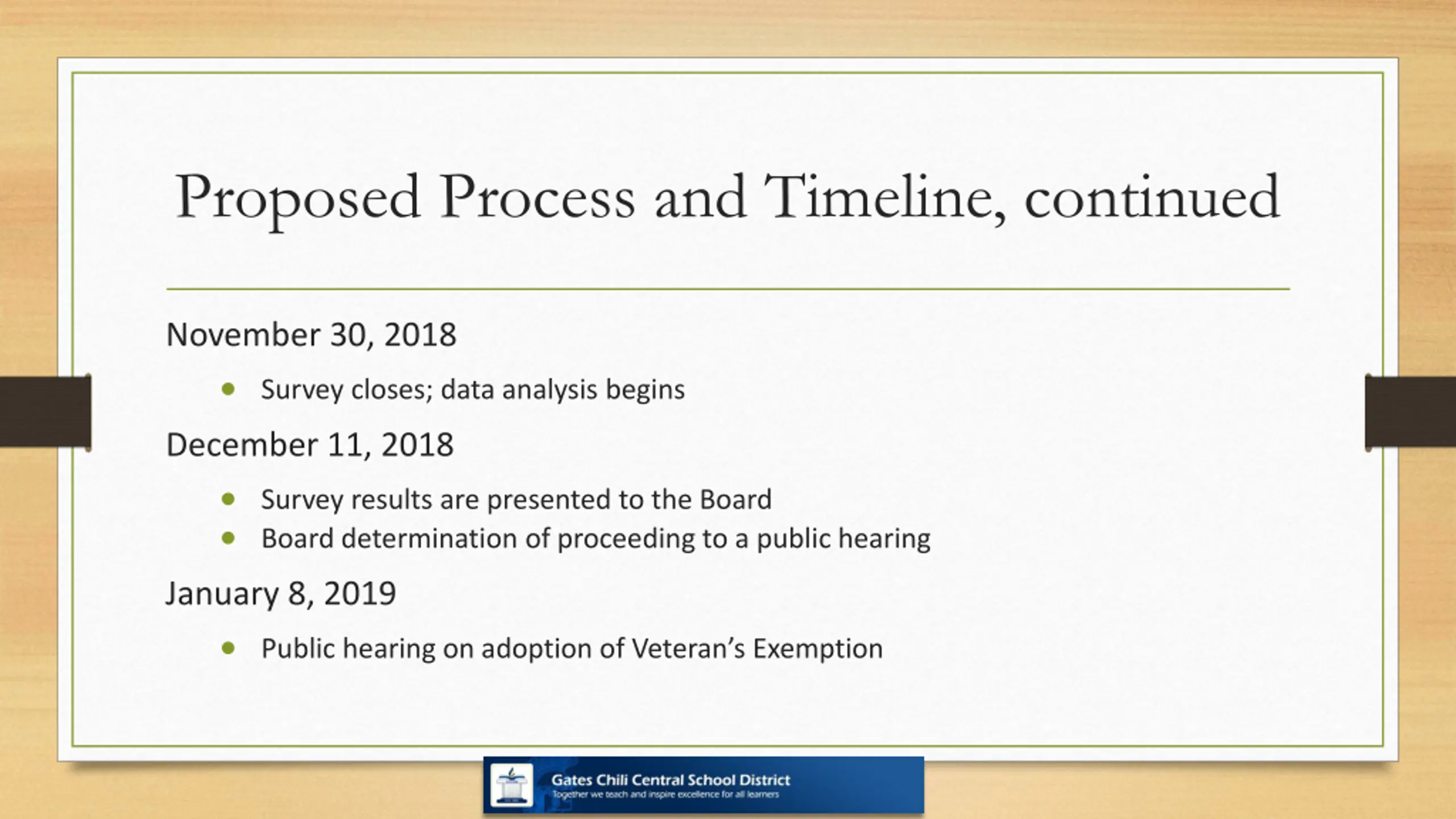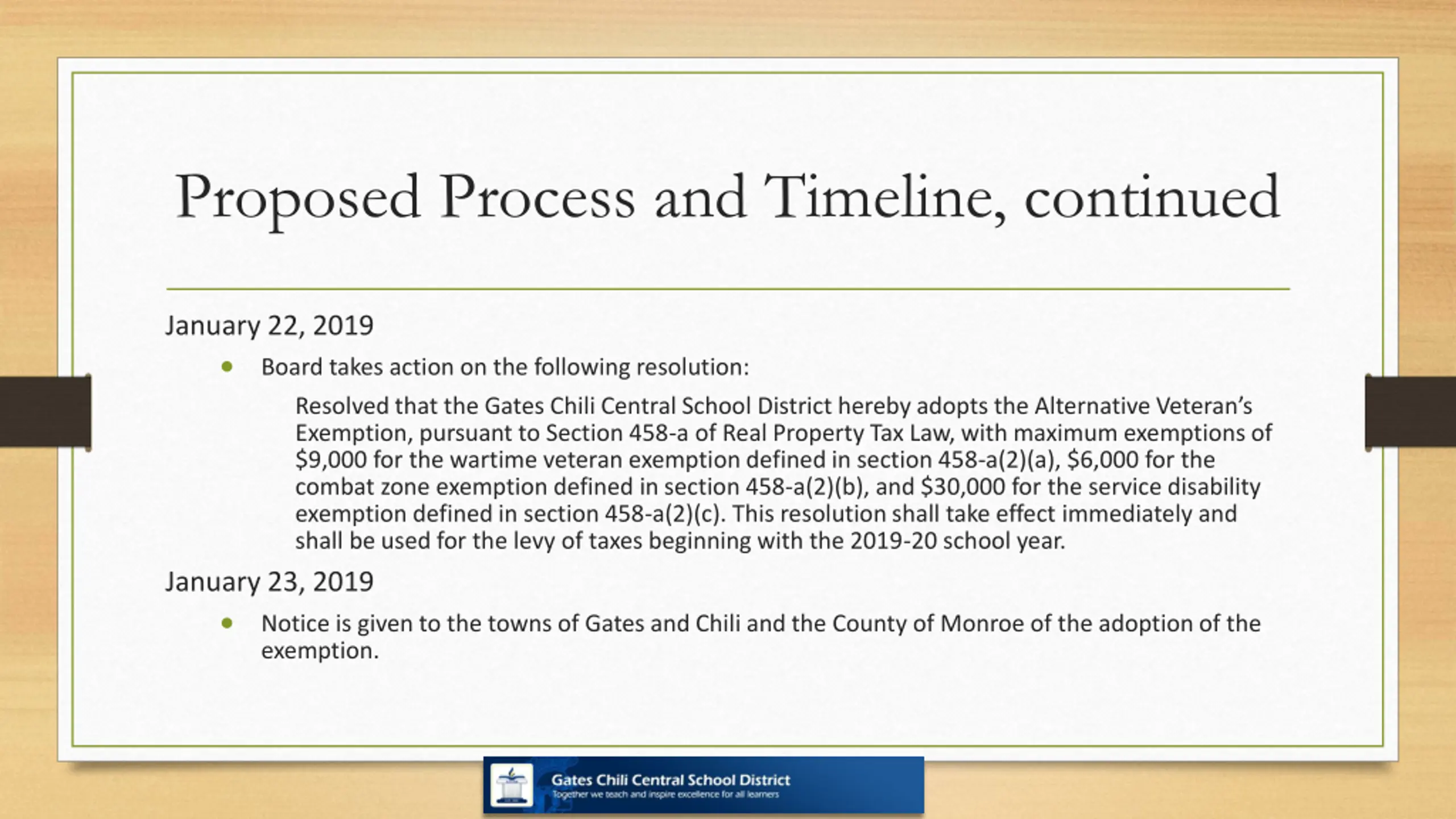 Proposed Process and Timeline, continued January 22, 2019 Board takes action on the following resolution: Resolved that the Gates Chili Central School District hereby adopts the Alternative Veteran s Exemption, pursuant to Section 458-a of Real Property Tax Law, with maximum exemptions of $9,000 for the wartime veteran exemption defined in section 458-a(2)(a), $6,000 for the combat zone exemption defined in section 458-a(2)(b), and $30,000 for the service disability exemption defined in section 458-a(2)(c). This resolution shall take effect immediately and shall be used for the levy of taxes beginning with the 2019-20 school year. January 23, 2019 Notice is given to the towns of Gates and Chili and the County of Monroe of the adoption of the exemption.