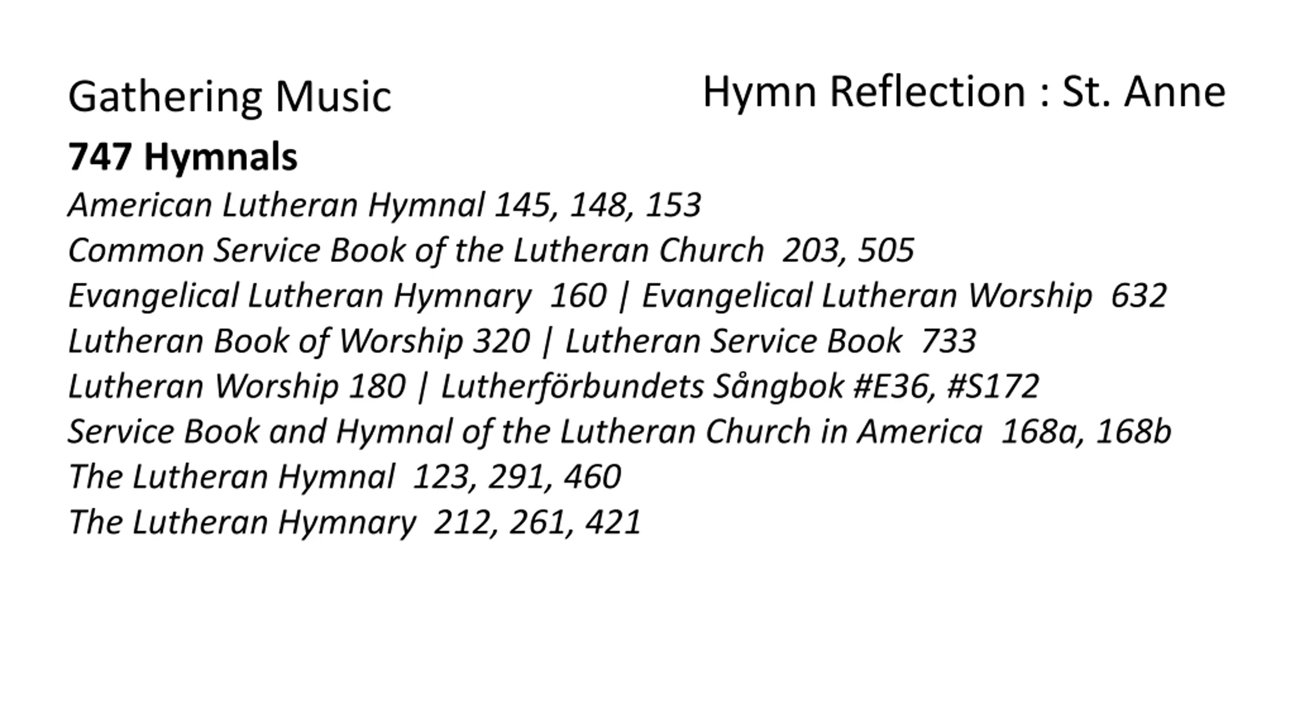 Hymn Reflection : St. Anne Gathering Music 747 Hymnals American Lutheran Hymnal 145, 148, 153 Common Service Book of the Lutheran Church 203, 505 Evangelical Lutheran Hymnary 160 | Evangelical Lutheran Worship 632 Lutheran Book of Worship 320 | Lutheran Service Book 733 Lutheran Worship 180 | Lutherf rbundets S ngbok #E36, #S172 Service Book and Hymnal of the Lutheran Church in America 168a, 168b The Lutheran Hymnal 123, 291, 460 The Lutheran Hymnary 212, 261, 421