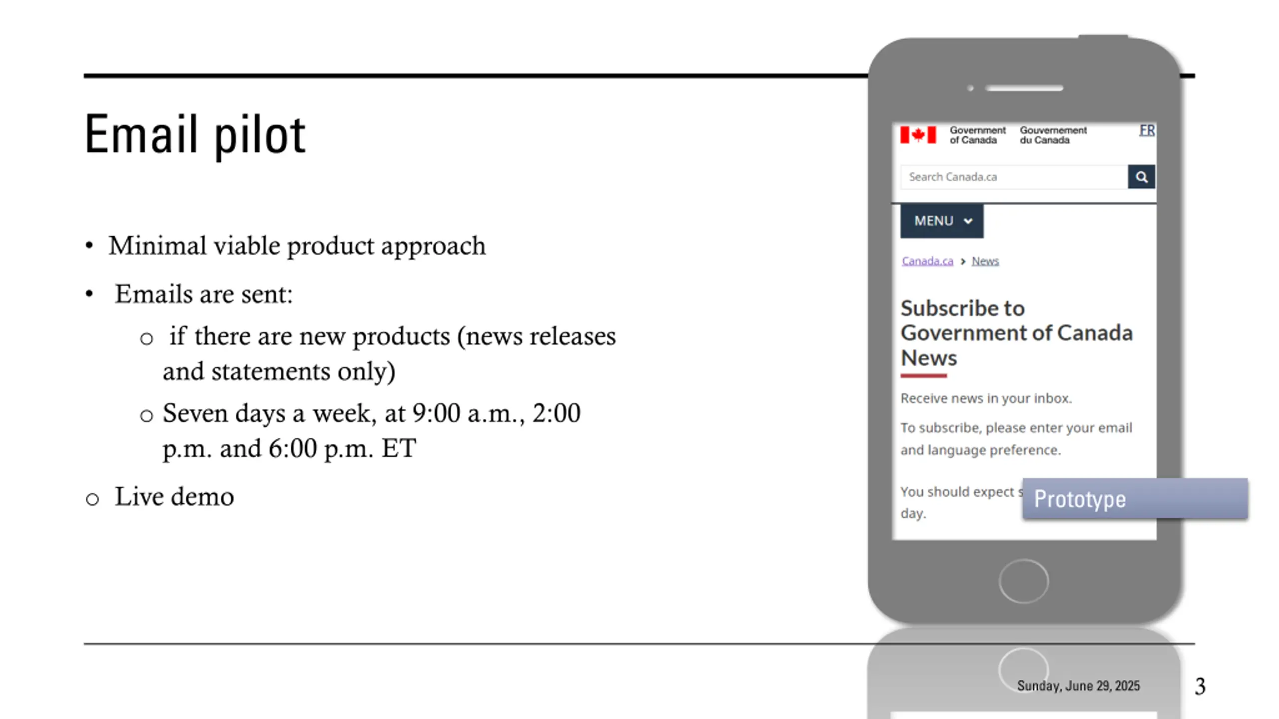 Email pilot Minimal viable product approach Emails are sent: o if there are new products (news releases and statements only) o Seven days a week, at 9:00 a.m., 2:00 p.m. and 6:00 p.m. ET o Live demo Prototype 3 Sunday, June 29, 2025