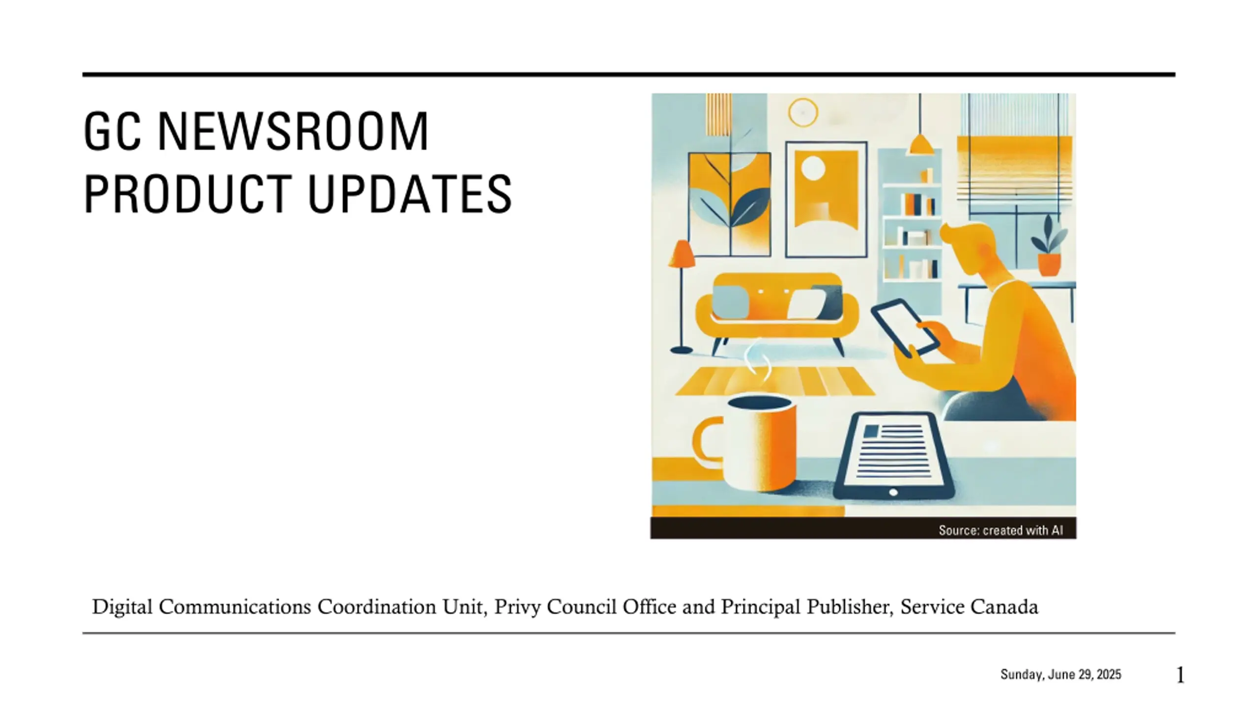 GC NEWSROOM PRODUCT UPDATES Source: created with AI Digital Communications Coordination Unit, Privy Council Office and Principal Publisher, Service Canada 1 Sunday, June 29, 2025