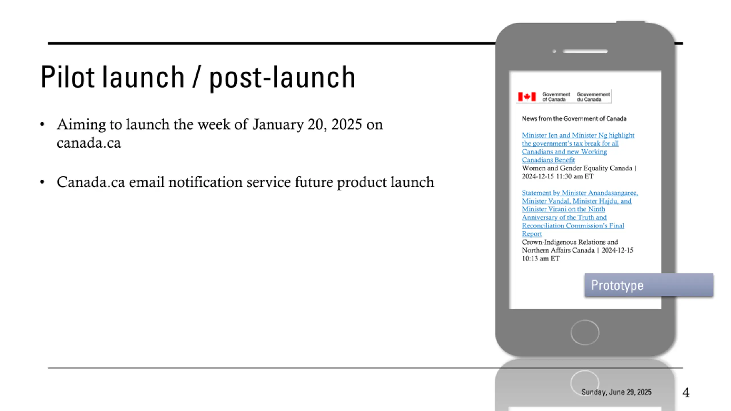 Pilot launch / post-launch Aiming to launch the week of January 20, 2025 on canada.ca News from the Government of Canada News from the Government of Canada Minister Ien and Minister Ng highlight the government s tax break for all Canadians and new Working Canadians Benefit Minister Ien and Minister Ng highlight the government s tax break for all Canadians and new Working Canadians Benefit Women and Gender Equality Canada | 2024-12-15 11:30 am ET Minister Ien and Minister Ng highlight the government s tax break for all Canadians and new Working Canadians Benefit Minister Ien and Minister Ng highlight the government s tax break for all Canadians and new Working Canadians Benefit Minister Ien and Minister Ng highlight the government s tax break for all Canadians and new Working Canadians Benefit Canada.ca email notification service future product launch Statement by Minister Anandasangaree, Minister Vandal, Minister Hajdu, and Minister Virani on the Ninth Anniversary of the Truth and Reconciliation Commission s Final Report Statement by Minister Anandasangaree, Minister Vandal, Minister Hajdu, and Minister Virani on the Ninth Anniversary of the Truth and Reconciliation Commission s Final Report Crown-Indigenous Relations and Northern Affairs Canada | 2024-12-15 10:13 am ET Statement by Minister Anandasangaree, Minister Vandal, Minister Hajdu, and Minister Virani on the Ninth Anniversary of the Truth and Reconciliation Commission s Final Report Statement by Minister Anandasangaree, Minister Vandal, Minister Hajdu, and Minister Virani on the Ninth Anniversary of the Truth and Reconciliation Commission s Final Report Statement by Minister Anandasangaree, Minister Vandal, Minister Hajdu, and Minister Virani on the Ninth Anniversary of the Truth and Reconciliation Commission s Final Report Statement by Minister Anandasangaree, Minister Vandal, Minister Hajdu, and Minister Virani on the Ninth Anniversary of the Truth and Reconciliation Commission s Final Report Statement by Minister Anandasangaree, Minister Vandal, Minister Hajdu, and Minister Virani on the Ninth Anniversary of the Truth and Reconciliation Commission s Final Report Prototype 4 Sunday, June 29, 2025