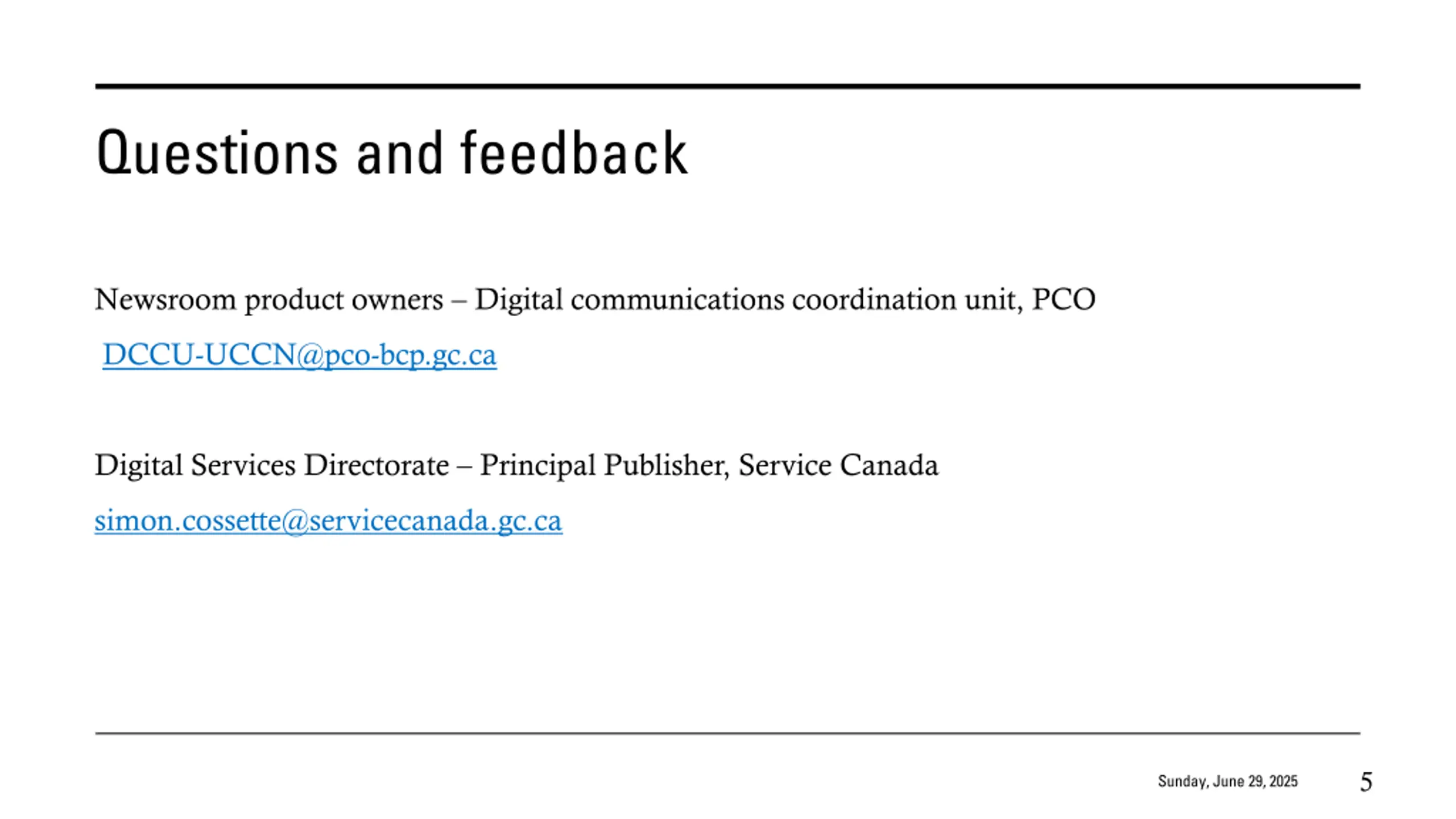 Questions and feedback Newsroom product owners Digital communications coordination unit, PCO DCCU-UCCN@pco-bcp.gc.ca Digital Services Directorate Principal Publisher, Service Canada simon.cossette@servicecanada.gc.ca 5 Sunday, June 29, 2025