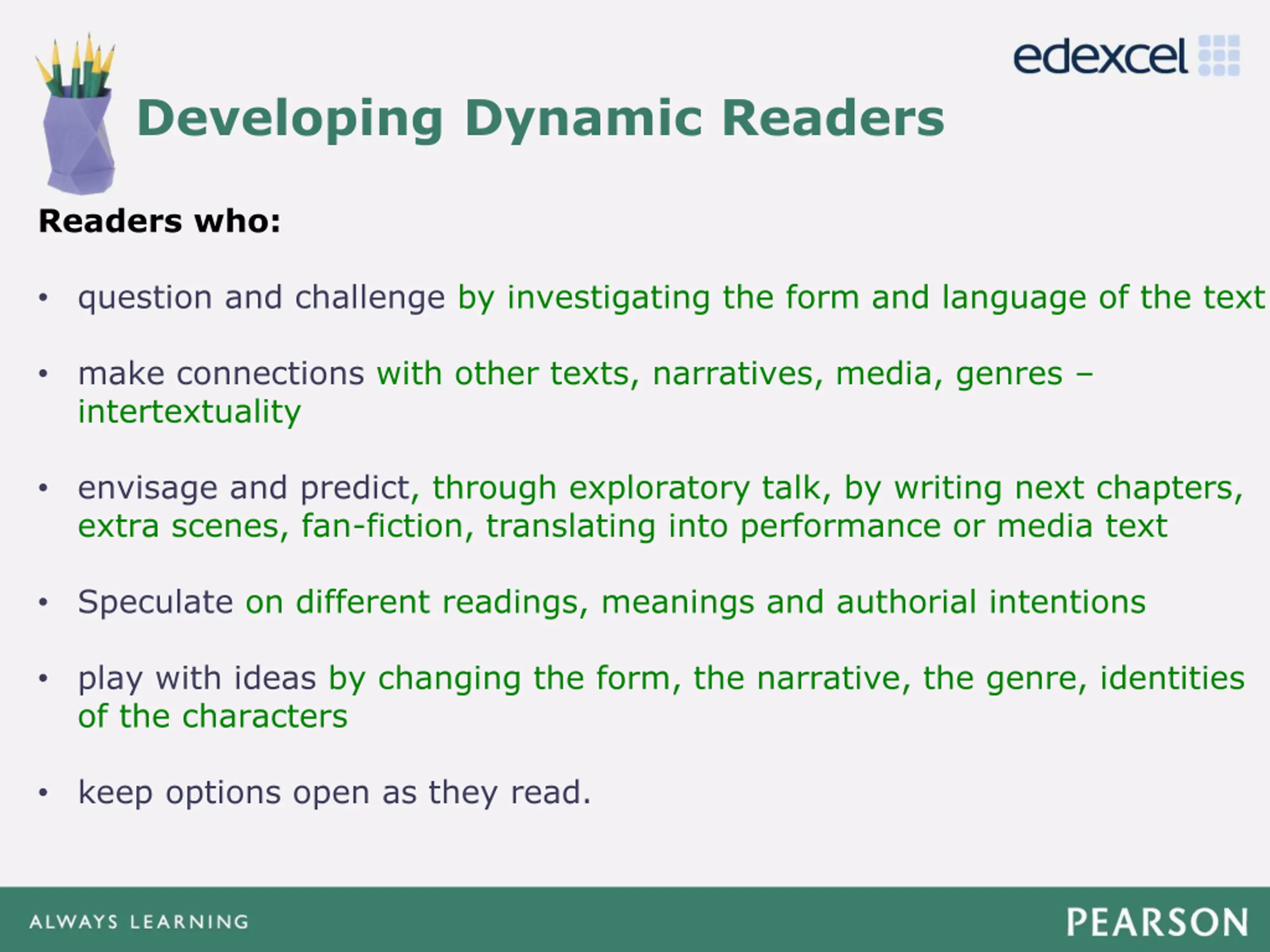 Developing Dynamic Readers Click to edit Master title style Readers who: Click to edit Master text styles Second level Third level Fourth level Fifth level envisage and predict, through exploratory talk, by writing next chapters, extra scenes, fan-fiction, translating into performance or media text question and challenge by investigating the form and language of the text make connections with other texts, narratives, media, genres intertextuality Speculate on different readings, meanings and authorial intentions play with ideas by changing the form, the narrative, the genre, identities of the characters keep options open as they read.