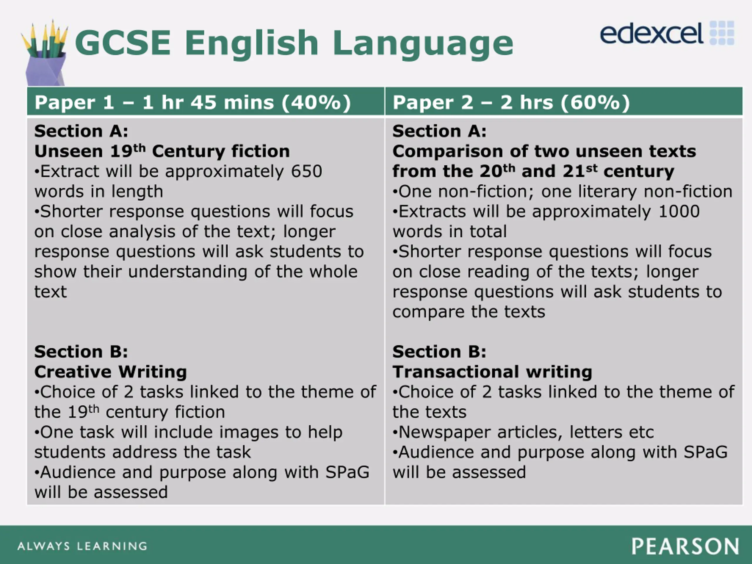 GCSE English Language Click to edit Master title style Paper 1 1 hr 45 mins (40%) Section A: Unseen 19thCentury fiction Extract will be approximately 650 words in length Shorter response questions will focus on close analysis of the text; longer response questions will ask students to show their understanding of the whole text Paper 2 2 hrs (60%) Section A: Comparison of two unseen texts from the 20thand 21stcentury One non-fiction; one literary non-fiction Extracts will be approximately 1000 words in total Shorter response questions will focus on close reading of the texts; longer response questions will ask students to compare the texts Click to edit Master text styles Second level Third level Fourth level Fifth level Section B: Creative Writing Choice of 2 tasks linked to the theme of the 19thcentury fiction One task will include images to help students address the task Audience and purpose along with SPaG will be assessed Section B: Transactional writing Choice of 2 tasks linked to the theme of the texts Newspaper articles, letters etc Audience and purpose along with SPaG will be assessed