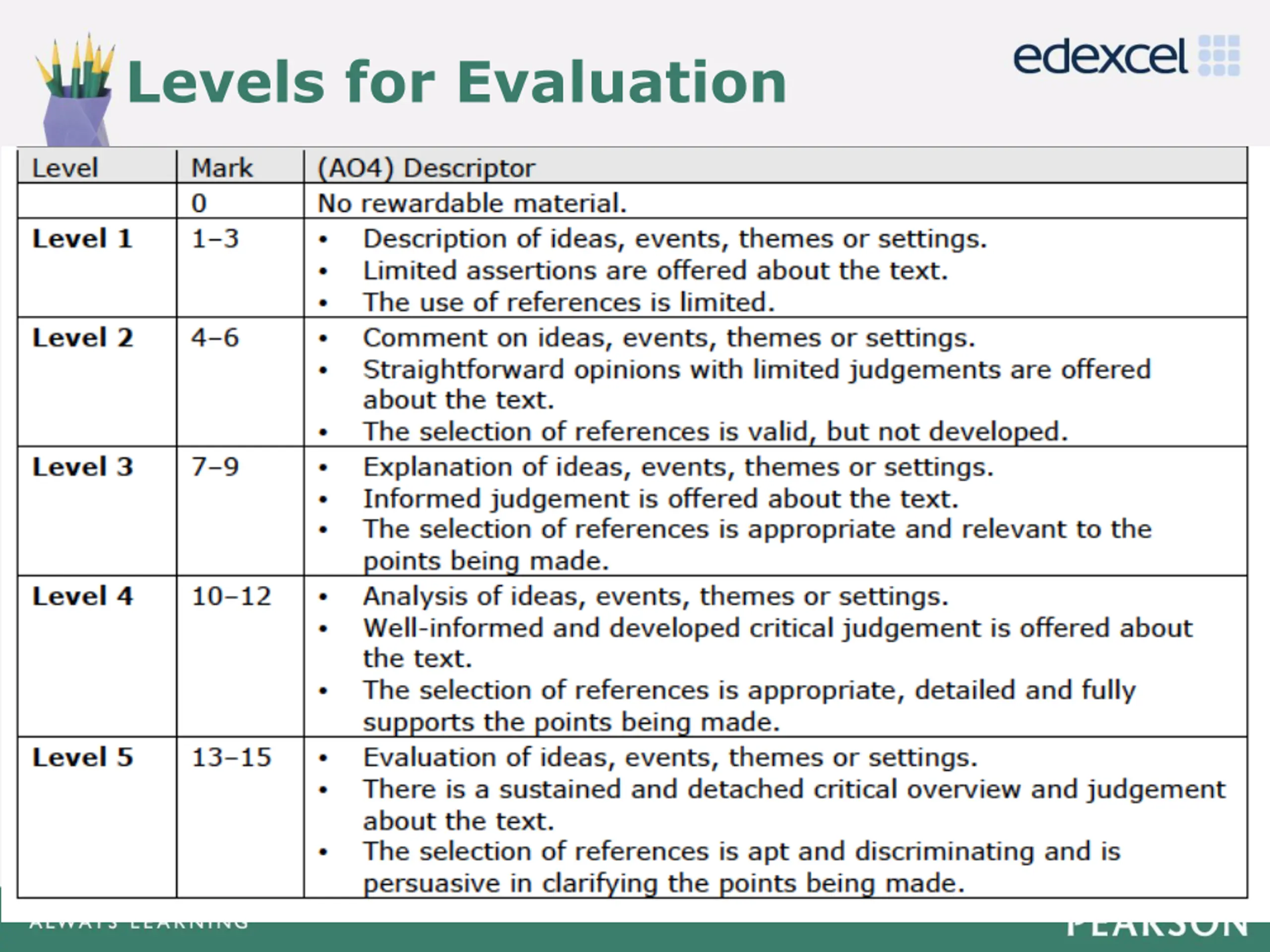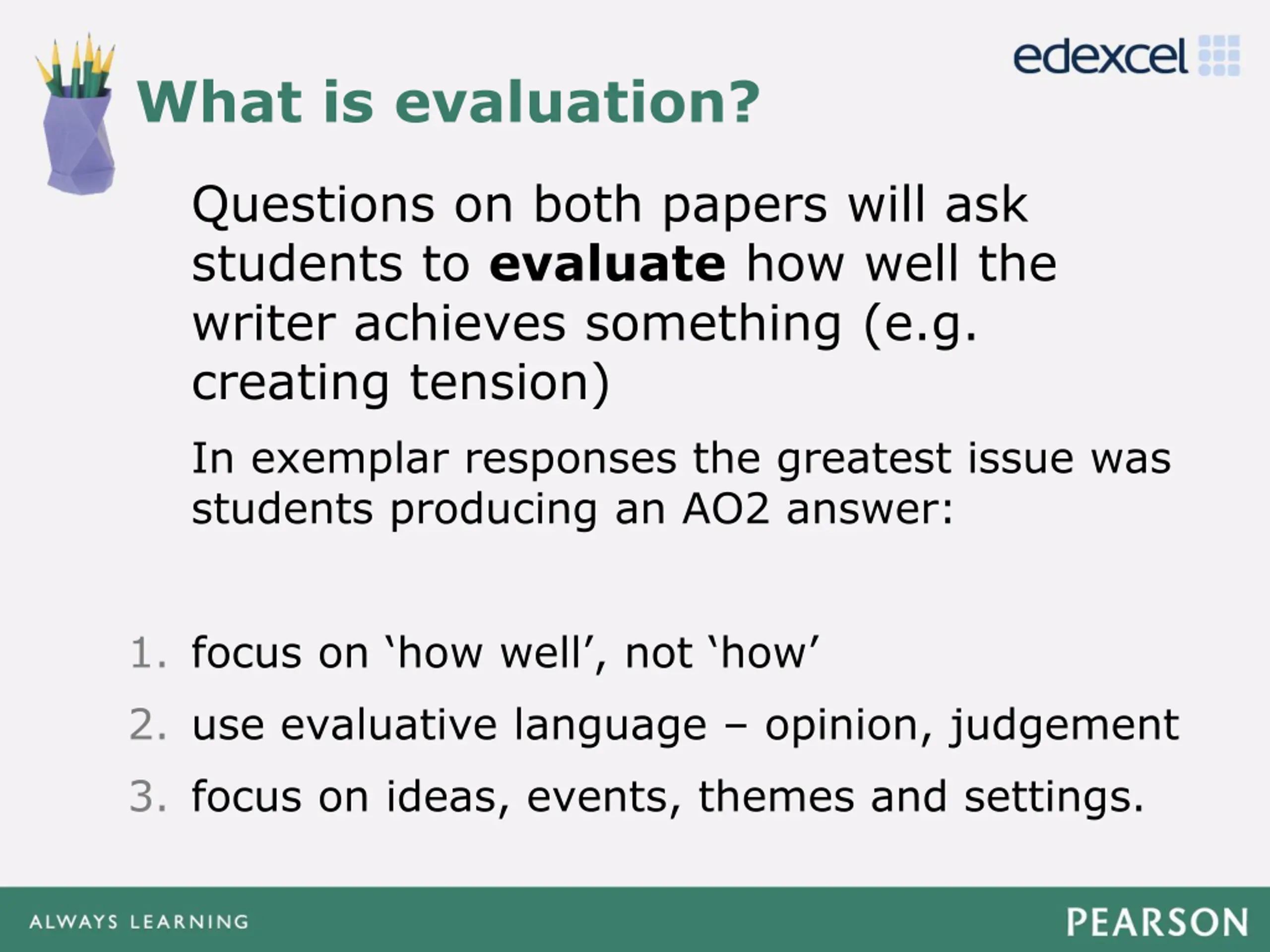What is evaluation? Click to edit Master title style Questions on both papers will ask students to evaluate how well the writer achieves something (e.g. creating tension) In exemplar responses the greatest issue was students producing an AO2 answer: Click to edit Master text styles Second level Third level Fourth level Fifth level 1. focus on how well , not how 2. use evaluative language opinion, judgement 3. focus on ideas, events, themes and settings.