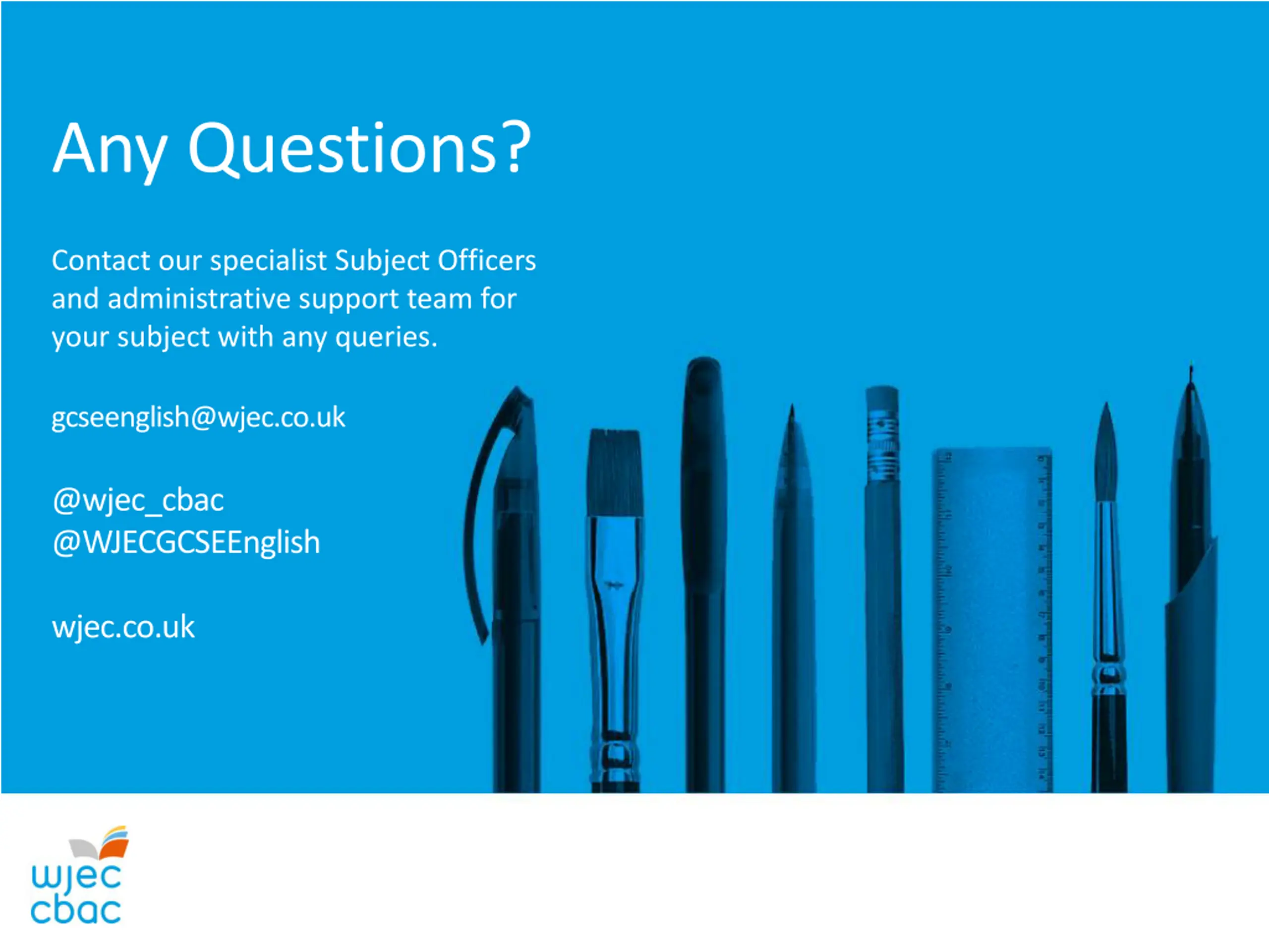 Any Questions? Contact our specialist Subject Officers and administrative support team for your subject with any queries. gcseenglish@wjec.co.uk @wjec_cbac @WJECGCSEEnglish wjec.co.uk