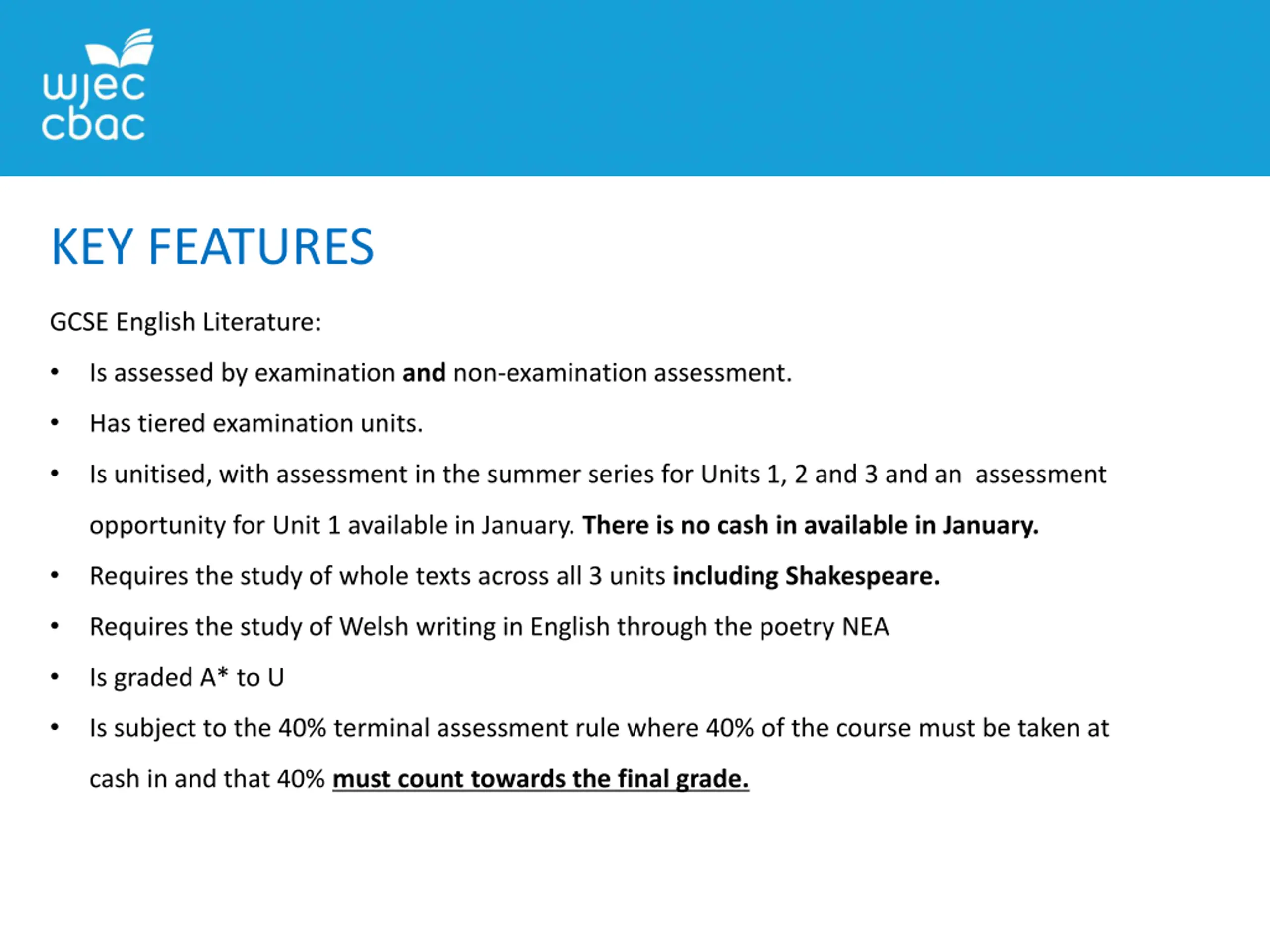 KEY FEATURES GCSE English Literature: Is assessed by examination and non-examination assessment. Has tiered examination units. Is unitised, with assessment in the summer series for Units 1, 2 and 3 and an assessment opportunity for Unit 1 available in January. There is no cash in available in January. Requires the study of whole texts across all 3 units including Shakespeare. Requires the study of Welsh writing in English through the poetry NEA Is graded A* to U Is subject to the 40% terminal assessment rule where 40% of the course must be taken at cash in and that 40% must count towards the final grade.