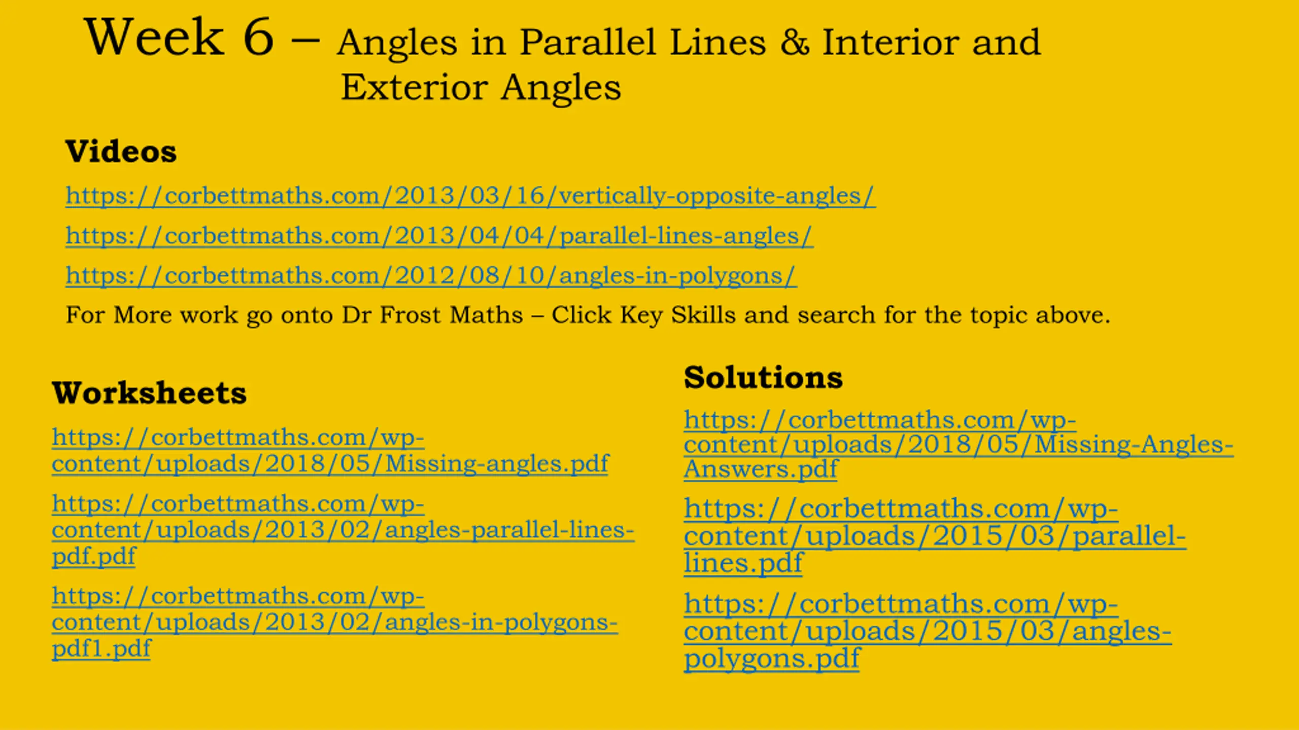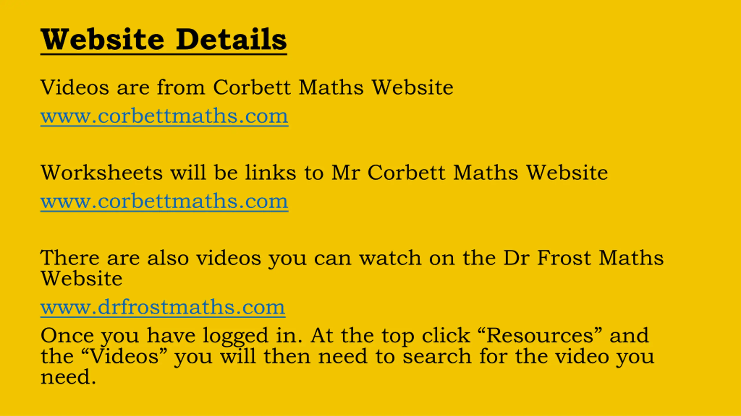 Website Details Videos are from Corbett Maths Website www.corbettmaths.com Worksheets will be links to Mr Corbett Maths Website www.corbettmaths.com There are also videos you can watch on the Dr Frost Maths Website www.drfrostmaths.com Once you have logged in. At the top click Resources and the Videos you will then need to search for the video you need.