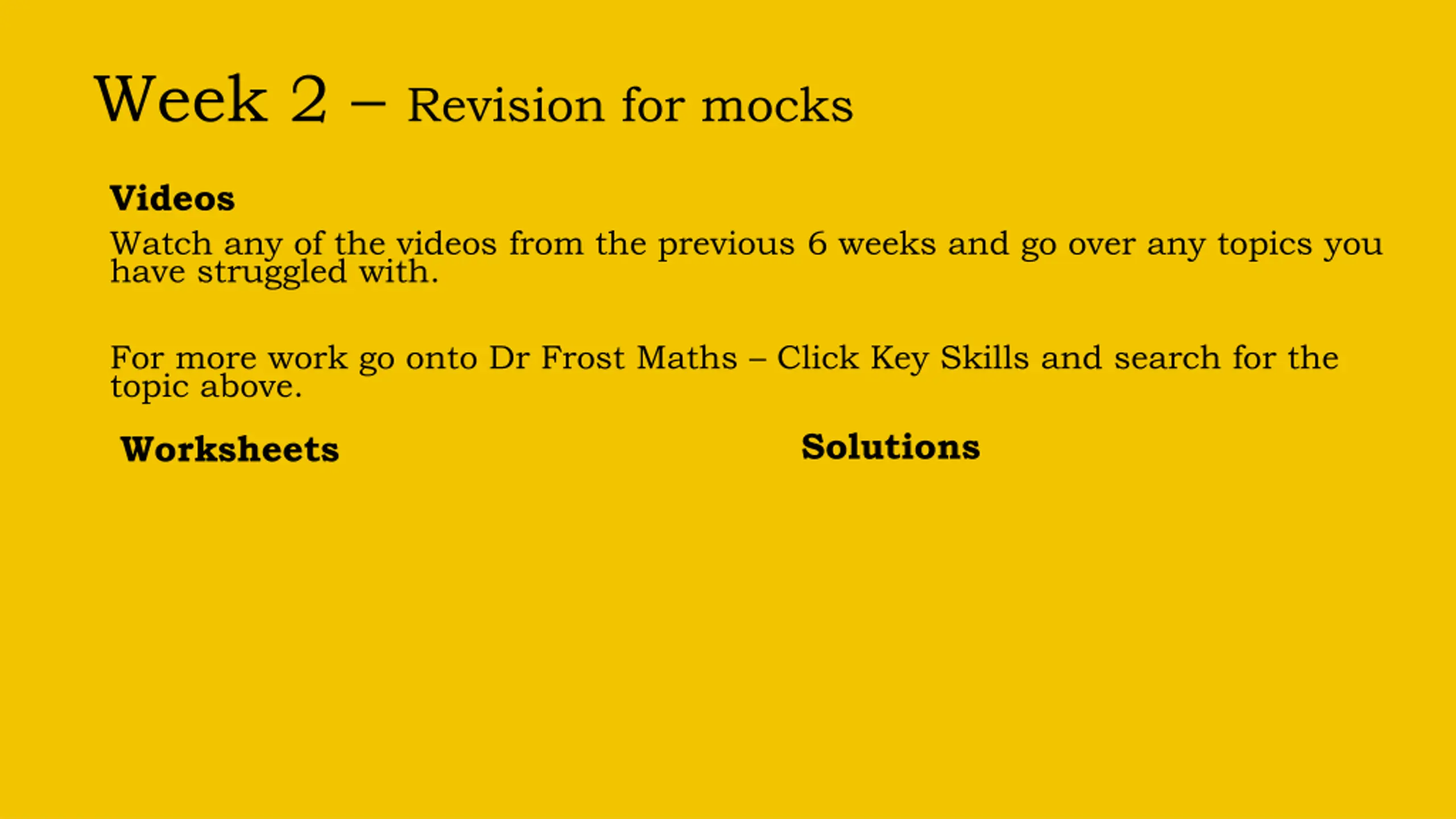 Week 2 Revision for mocks Videos Watch any of the videos from the previous 6 weeks and go over any topics you have struggled with. For more work go onto Dr Frost Maths Click Key Skills and search for the topic above. Solutions Worksheets