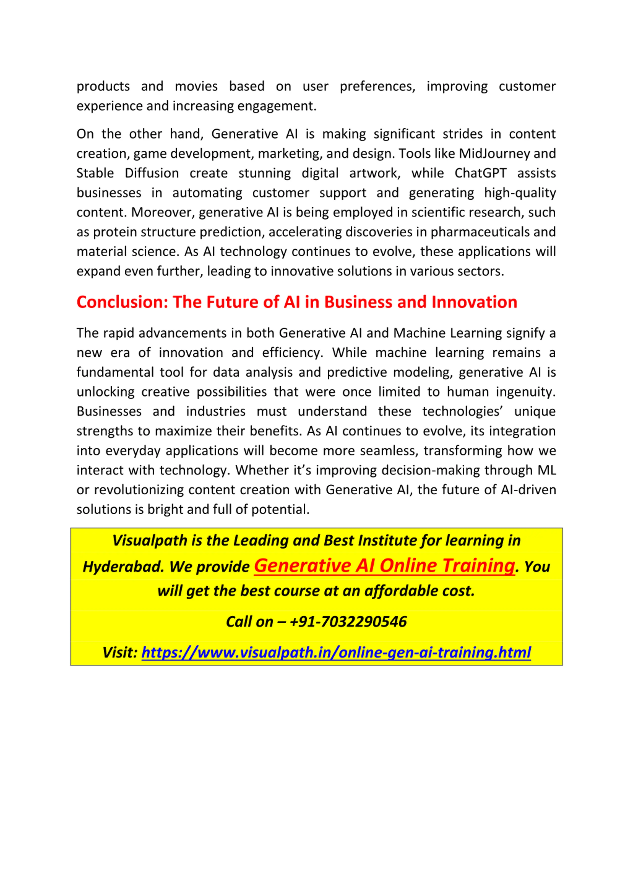 products and movies based on user preferences, improving customer experience and increasing engagement. On the other hand, Generative AI is making significant strides in content creation, game development, marketing, and design. Tools like MidJourney and Stable Diffusion create stunning digital artwork, while ChatGPT assists businesses in automating customer support and generating high-quality content. Moreover, generative AI is being employed in scientific research, such as protein structure prediction, accelerating discoveries in pharmaceuticals and material science. As AI technology continues to evolve, these applications will expand even further, leading to innovative solutions in various sectors. Conclusion: The Future of AI in Business and Innovation The rapid advancements in both Generative AI and Machine Learning signify a new era of innovation and efficiency. While machine learning remains a fundamental tool for data analysis and predictive modeling, generative AI is unlocking creative possibilities that were once limited to human ingenuity. Businesses and industries must understand these technologies unique strengths to maximize their benefits. As AI continues to evolve, its integration into everyday applications will become more seamless, transforming how we interact with technology. Whether it s improving decision-making through ML or revolutionizing content creation with Generative AI, the future of AI-driven solutions is bright and full of potential. Visualpath is the Leading and Best Institute for learning in Hyderabad. We provide Generative AI Online Training. You will get the best course at an affordable cost. Call on +91-7032290546 Visit: https://www.visualpath.in/online-gen-ai-training.html