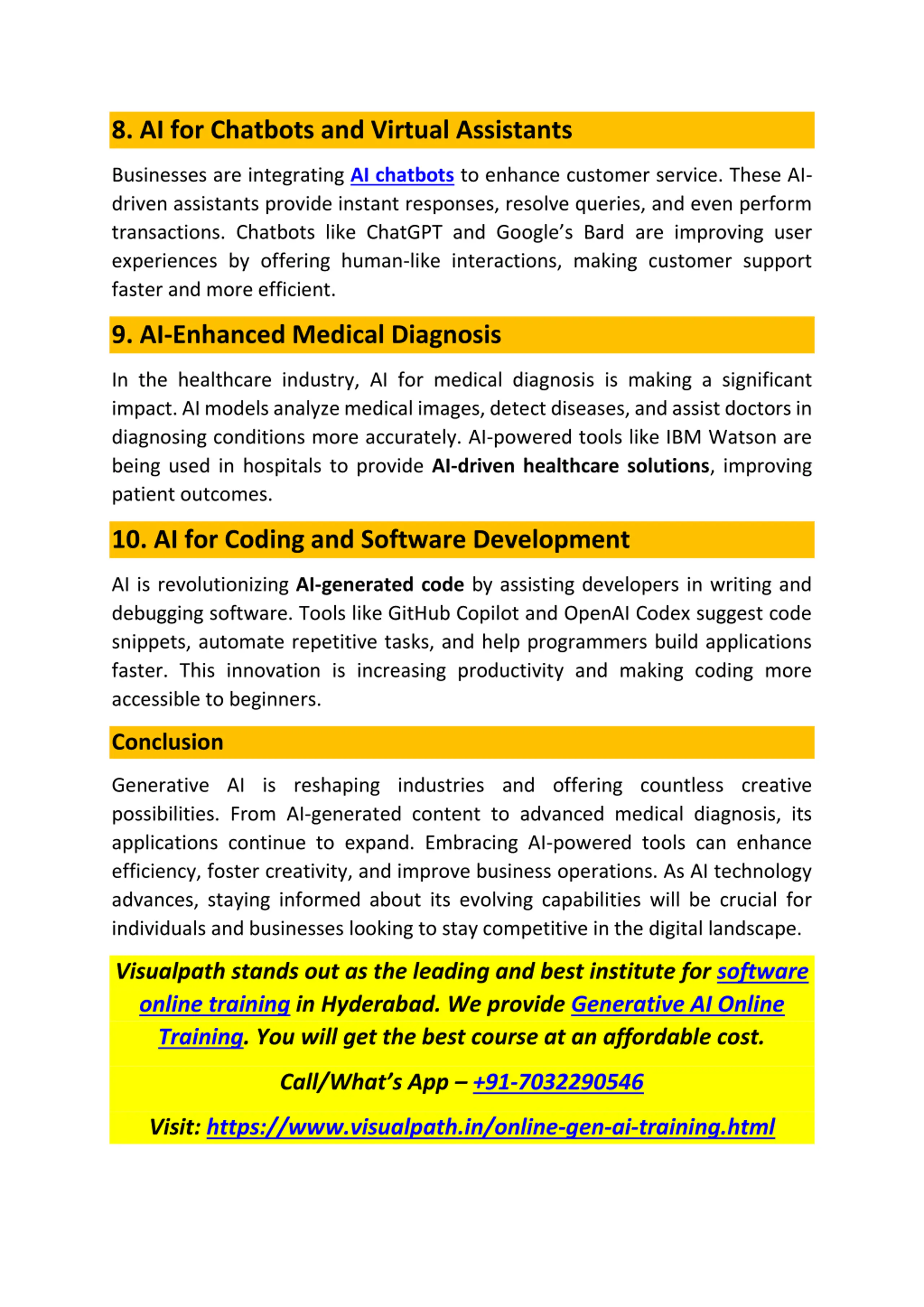 8. AI for Chatbots and Virtual Assistants Businesses are integrating AI chatbots to enhance customer service. These AI- driven assistants provide instant responses, resolve queries, and even perform transactions. Chatbots like ChatGPT and Google s Bard are improving user experiences by offering human-like interactions, making customer support faster and more efficient. 9. AI-Enhanced Medical Diagnosis In the healthcare industry, AI for medical diagnosis is making a significant impact. AI models analyze medical images, detect diseases, and assist doctors in diagnosing conditions more accurately. AI-powered tools like IBM Watson are being used in hospitals to provide AI-driven healthcare solutions, improving patient outcomes. 10. AI for Coding and Software Development AI is revolutionizing AI-generated code by assisting developers in writing and debugging software. Tools like GitHub Copilot and OpenAI Codex suggest code snippets, automate repetitive tasks, and help programmers build applications faster. This innovation is increasing productivity and making coding more accessible to beginners. Conclusion Generative AI is reshaping industries and offering countless creative possibilities. From AI-generated content to advanced medical diagnosis, its applications continue to expand. Embracing AI-powered tools can enhance efficiency, foster creativity, and improve business operations. As AI technology advances, staying informed about its evolving capabilities will be crucial for individuals and businesses looking to stay competitive in the digital landscape. Visualpath stands out as the leading and best institute for software online training in Hyderabad. We provide Generative AI Online Training. You will get the best course at an affordable cost. Call/What s App +91-7032290546 Visit: https://www.visualpath.in/online-gen-ai-training.html