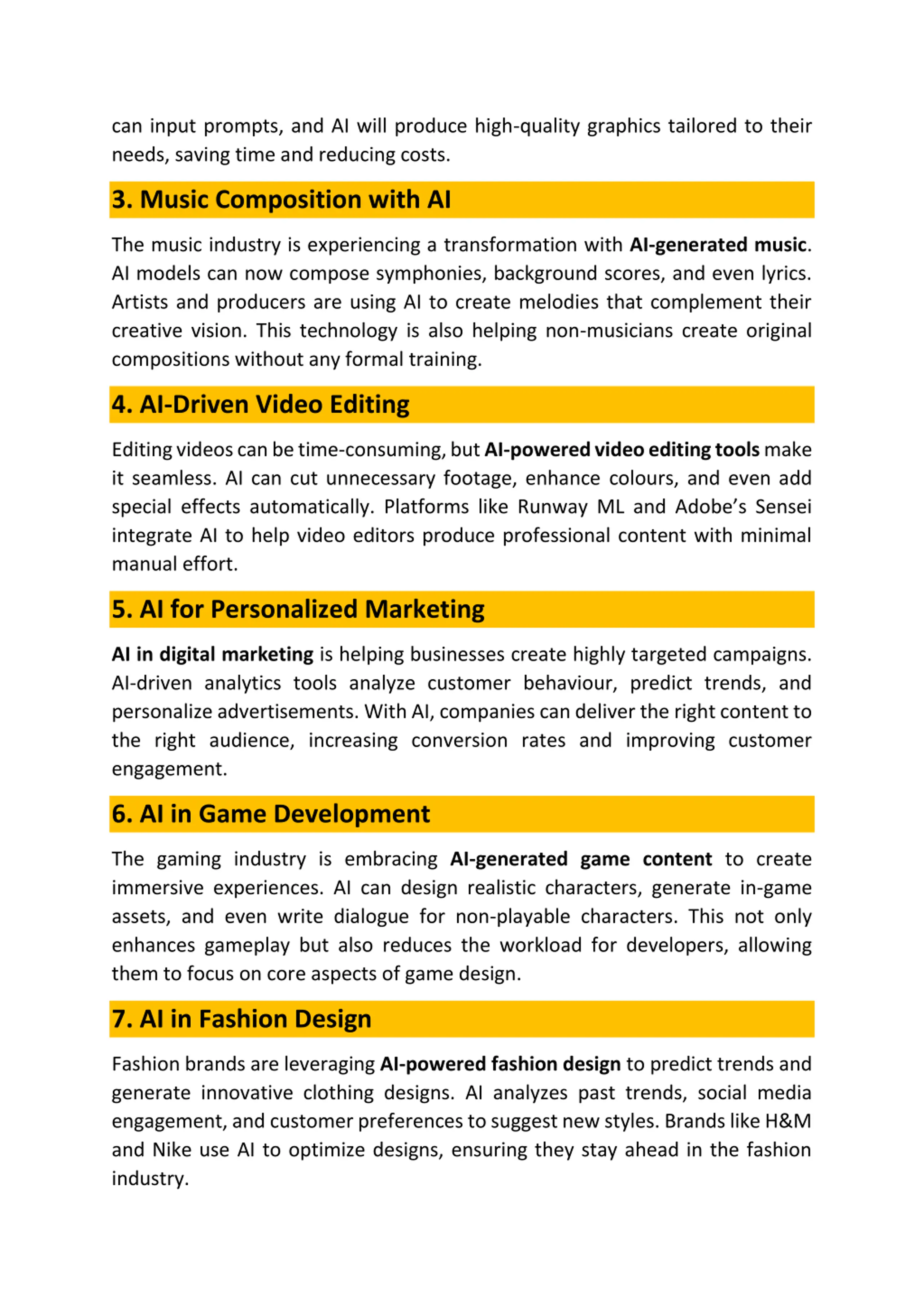 can input prompts, and AI will produce high-quality graphics tailored to their needs, saving time and reducing costs. 3. Music Composition with AI The music industry is experiencing a transformation with AI-generated music. AI models can now compose symphonies, background scores, and even lyrics. Artists and producers are using AI to create melodies that complement their creative vision. This technology is also helping non-musicians create original compositions without any formal training. 4. AI-Driven Video Editing Editing videos can be time-consuming, but AI-powered video editing tools make it seamless. AI can cut unnecessary footage, enhance colours, and even add special effects automatically. Platforms like Runway ML and Adobe s Sensei integrate AI to help video editors produce professional content with minimal manual effort. 5. AI for Personalized Marketing AI in digital marketing is helping businesses create highly targeted campaigns. AI-driven analytics tools analyze customer behaviour, predict trends, and personalize advertisements. With AI, companies can deliver the right content to the right audience, increasing conversion rates and improving customer engagement. 6. AI in Game Development The gaming industry is embracing AI-generated game content to create immersive experiences. AI can design realistic characters, generate in-game assets, and even write dialogue for non-playable characters. This not only enhances gameplay but also reduces the workload for developers, allowing them to focus on core aspects of game design. 7. AI in Fashion Design Fashion brands are leveraging AI-powered fashion design to predict trends and generate innovative clothing designs. AI analyzes past trends, social media engagement, and customer preferences to suggest new styles. Brands like H&M and Nike use AI to optimize designs, ensuring they stay ahead in the fashion industry.