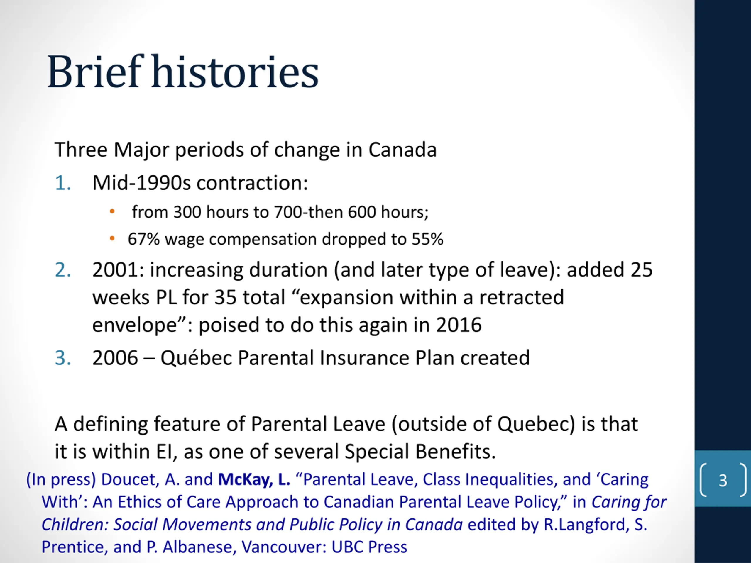 Brief histories Three Major periods of change in Canada 1. Mid-1990s contraction: from 300 hours to 700-then 600 hours; 67% wage compensation dropped to 55% 2. 2001: increasing duration (and later type of leave): added 25 weeks PL for 35 total expansion within a retracted envelope : poised to do this again in 2016 3. 2006 Qu bec Parental Insurance Plan created A defining feature of Parental Leave (outside of Quebec) is that it is within EI, as one of several Special Benefits. (In press) Doucet, A. and McKay, L. Parental Leave, Class Inequalities, and Caring With : An Ethics of Care Approach to Canadian Parental Leave Policy, in Caring for Children: Social Movements and Public Policy in Canada edited by R.Langford, S. Prentice, and P. Albanese, Vancouver: UBC Press 3