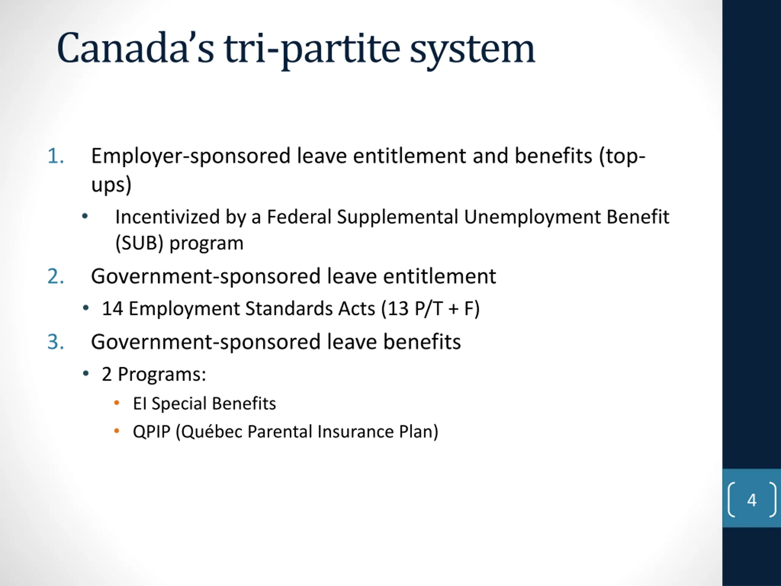 Canadas tri-partite system 1. Employer-sponsored leave entitlement and benefits (top- ups) Incentivized by a Federal Supplemental Unemployment Benefit (SUB) program Government-sponsored leave entitlement 14 Employment Standards Acts (13 P/T + F) Government-sponsored leave benefits 2 Programs: EI Special Benefits QPIP (Qu bec Parental Insurance Plan) 2. 3. 4