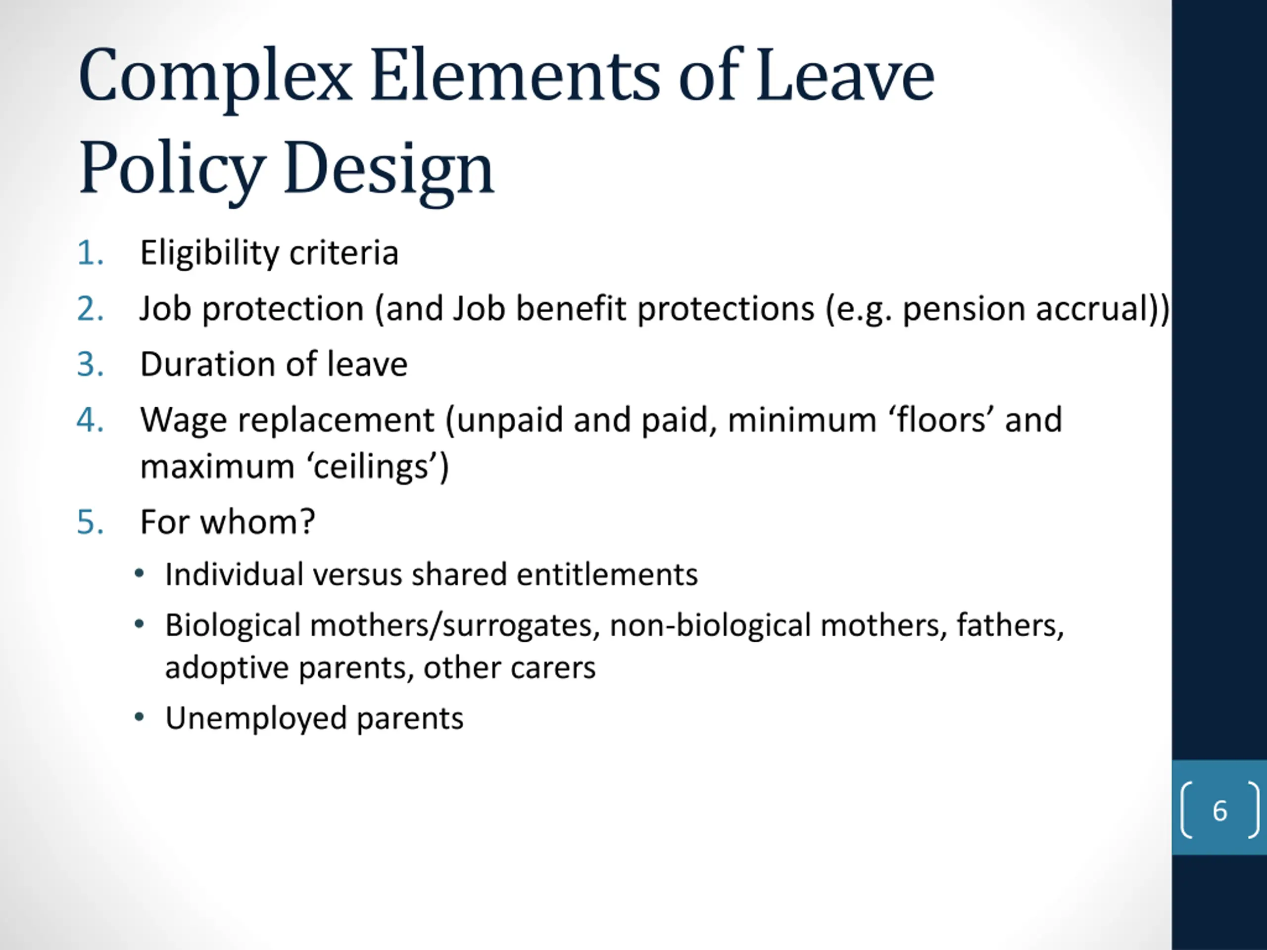 Complex Elements of Leave Policy Design 1. Eligibility criteria 2. Job protection (and Job benefit protections (e.g. pension accrual)) 3. Duration of leave 4. Wage replacement (unpaid and paid, minimum floors and maximum ceilings ) 5. For whom? Individual versus shared entitlements Biological mothers/surrogates, non-biological mothers, fathers, adoptive parents, other carers Unemployed parents 6