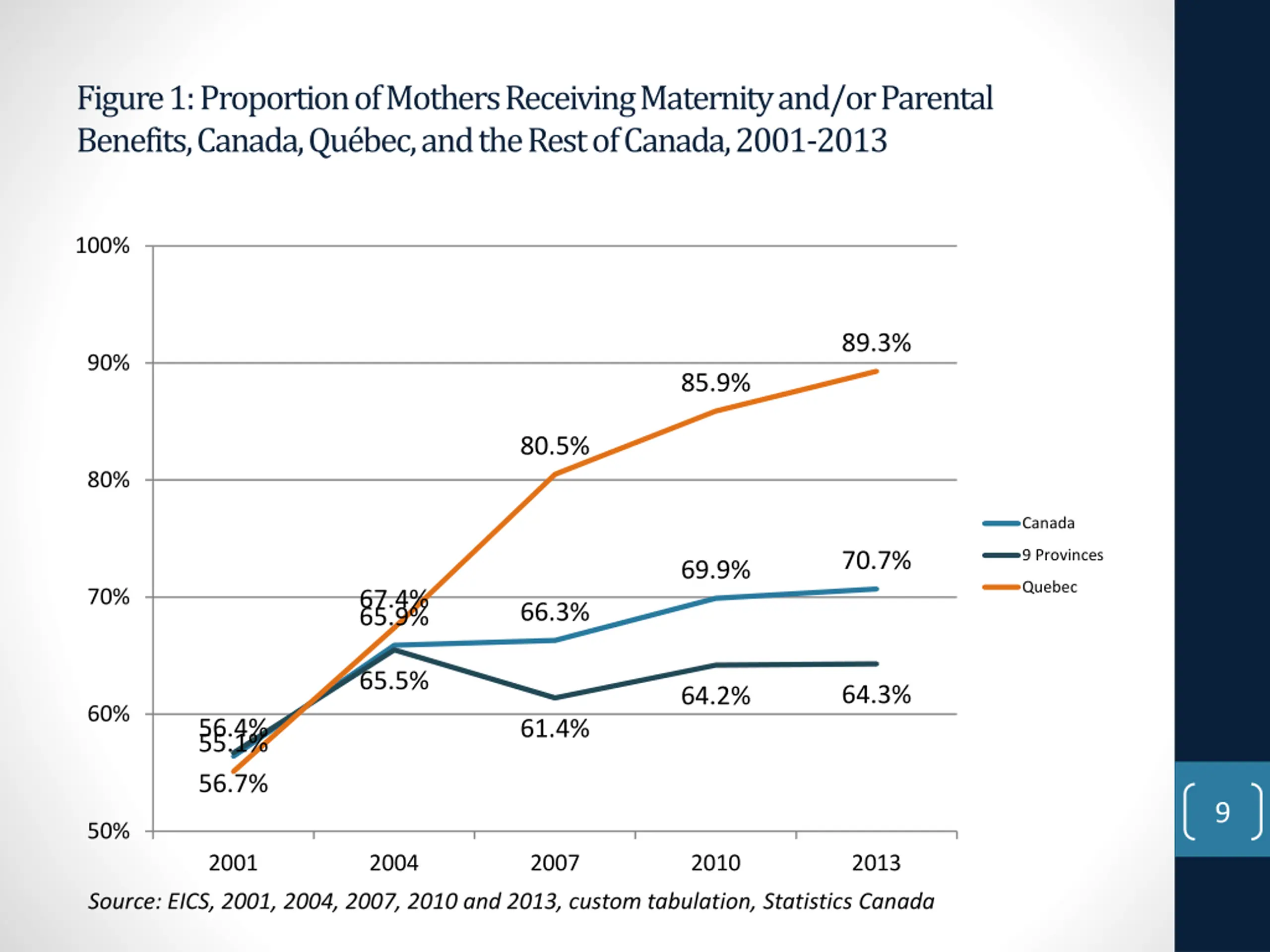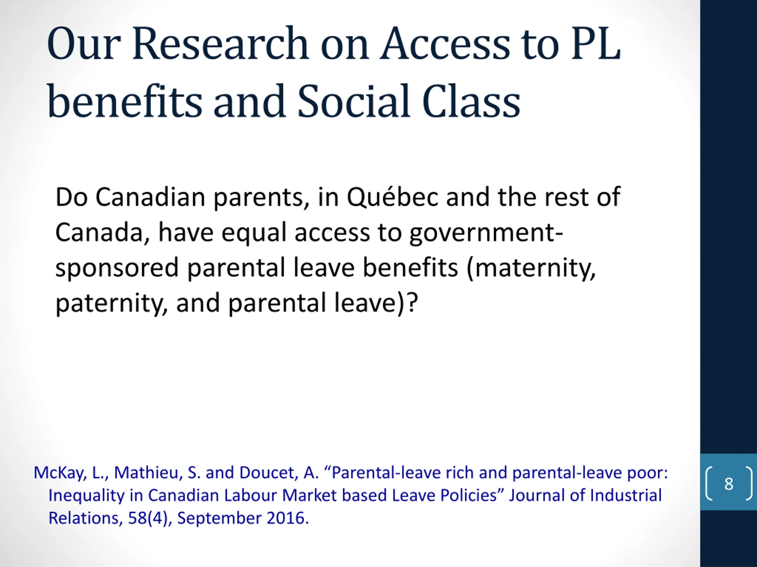 Our Research on Access to PL benefits and Social Class Do Canadian parents, in Qu bec and the rest of Canada, have equal access to government- sponsored parental leave benefits (maternity, paternity, and parental leave)? McKay, L., Mathieu, S. and Doucet, A. Parental-leave rich and parental-leave poor: Inequality in Canadian Labour Market based Leave Policies Journal of Industrial Relations, 58(4), September 2016. 8