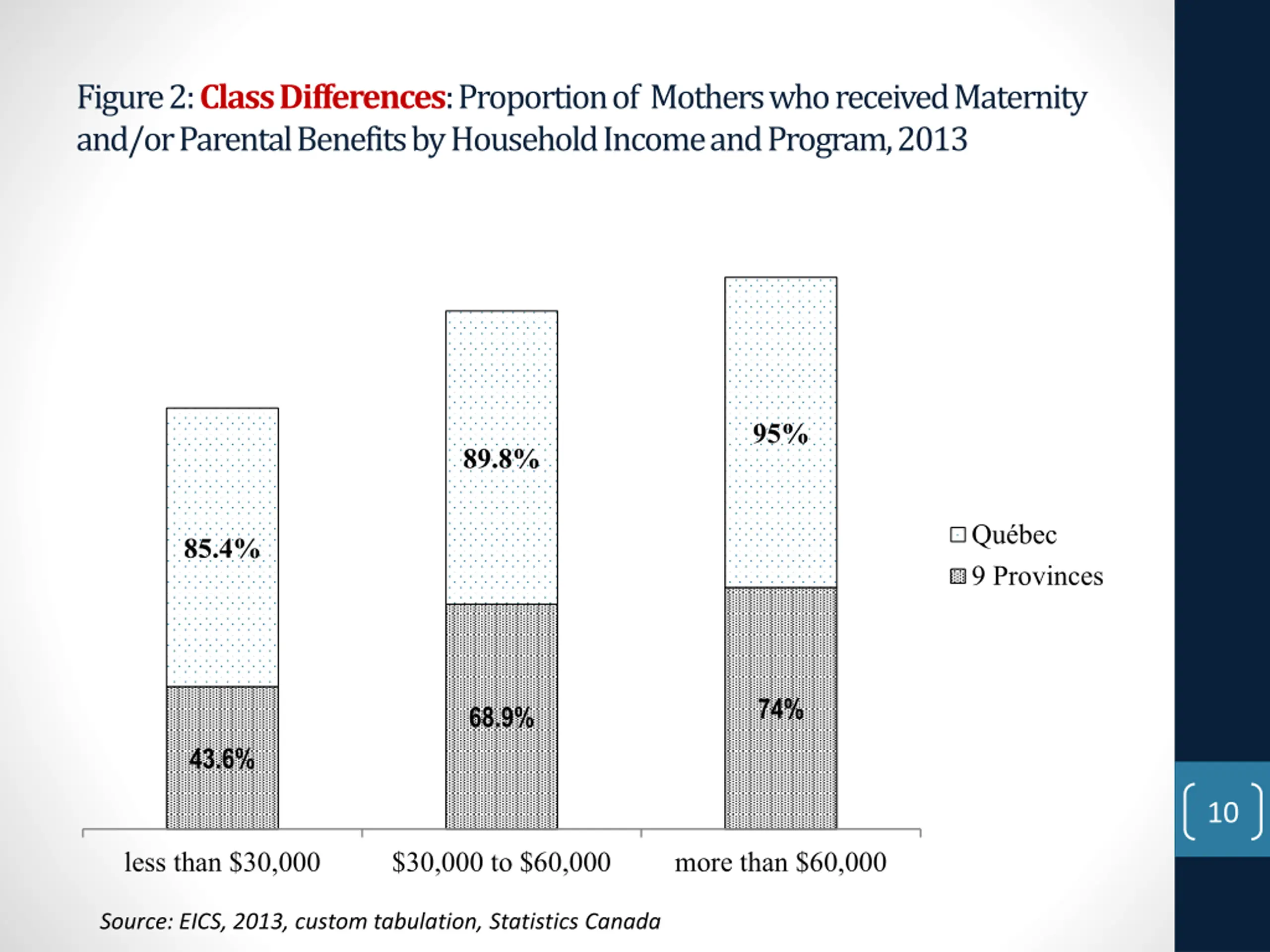 Figure 2: Class Differences: Proportion of Mothers who received Maternity and/or Parental Benefits by Household Income and Program, 2013 95% 89.8% Qu bec 9 Provinces 85.4% 74% 68.9% 43.6% 10 less than $30,000 $30,000 to $60,000 more than $60,000 Source: EICS, 2013, custom tabulation, Statistics Canada