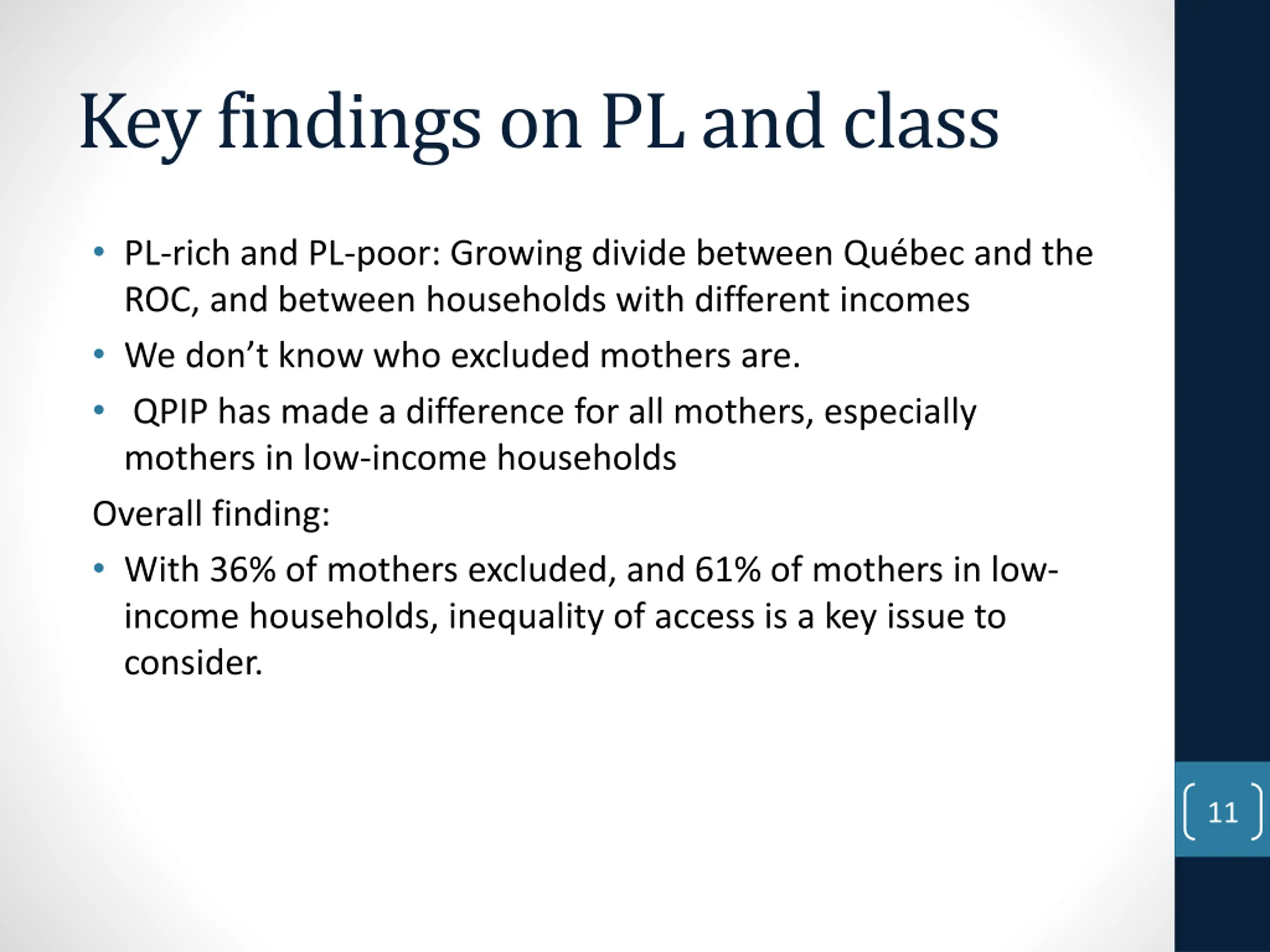 Key findings on PL and class PL-rich and PL-poor: Growing divide between Qu bec and the ROC, and between households with different incomes We don t know who excluded mothers are. QPIP has made a difference for all mothers, especially mothers in low-income households Overall finding: With 36% of mothers excluded, and 61% of mothers in low- income households, inequality of access is a key issue to consider. 11