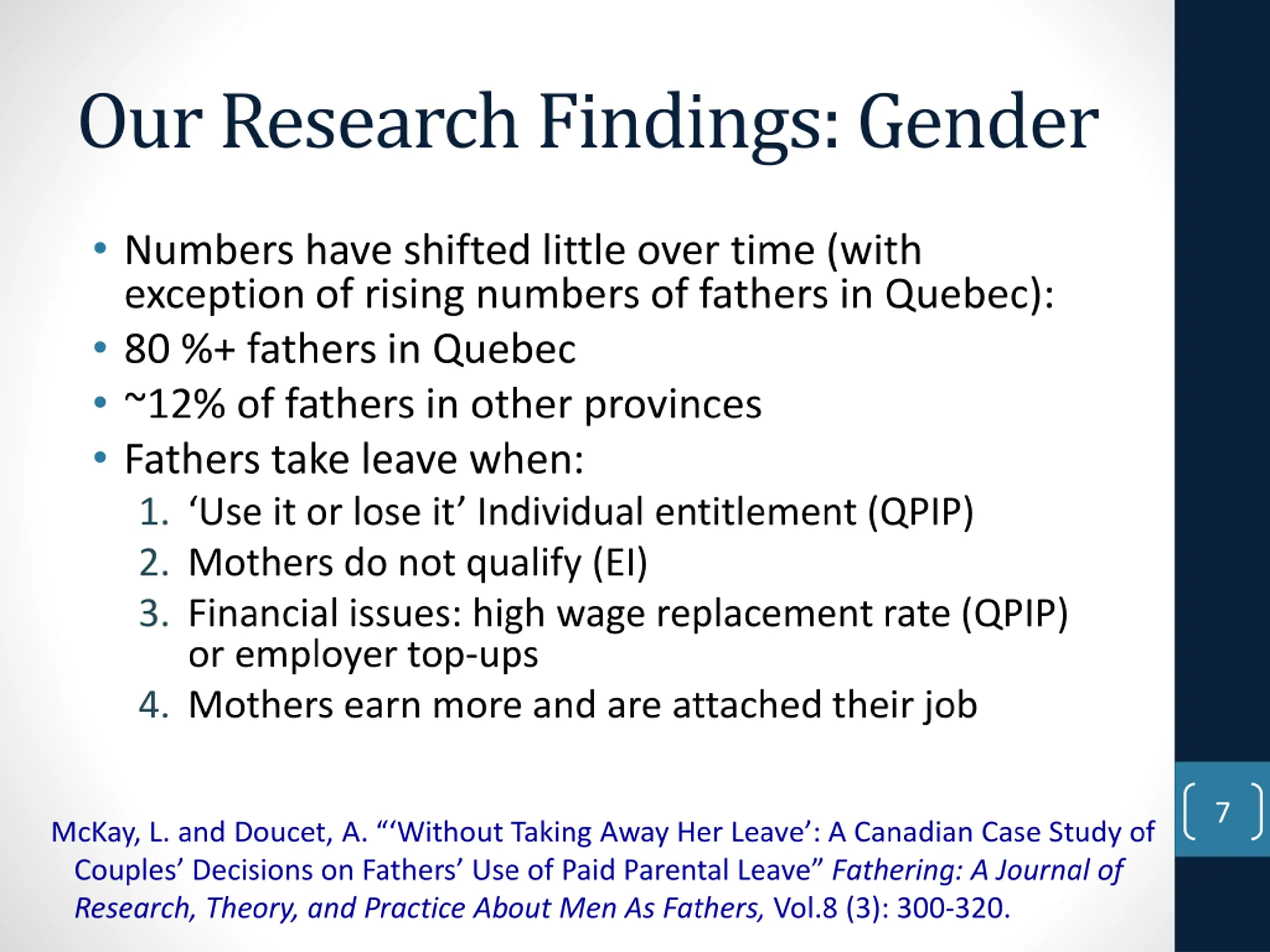 Our Research Findings: Gender Numbers have shifted little over time (with exception of rising numbers of fathers in Quebec): 80 %+ fathers in Quebec ~12% of fathers in other provinces Fathers take leave when: 1. Use it or lose it Individual entitlement (QPIP) 2. Mothers do not qualify (EI) 3. Financial issues: high wage replacement rate (QPIP) or employer top-ups 4. Mothers earn more and are attached their job 7 McKay, L. and Doucet, A. Without Taking Away Her Leave : A Canadian Case Study of Couples Decisions on Fathers Use of Paid Parental Leave Fathering: A Journal of Research, Theory, and Practice About Men As Fathers, Vol.8 (3): 300-320.